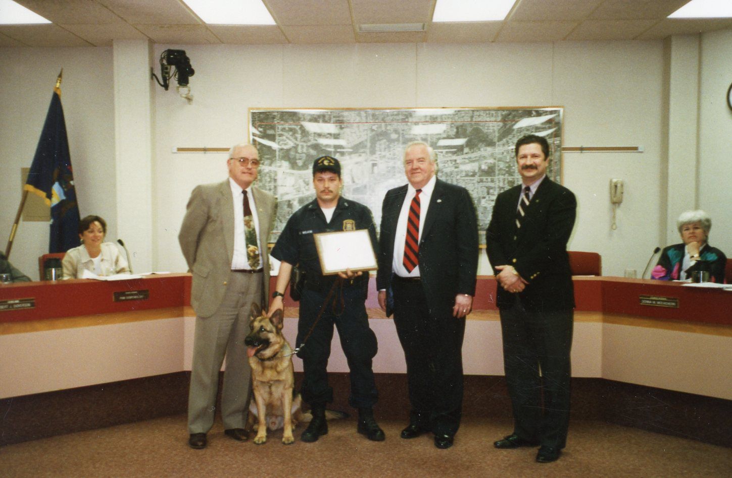 John Colligan, Bullette (Dog), Brian Wojcik, Ken Warfield, John Zech. First K-9 unit.