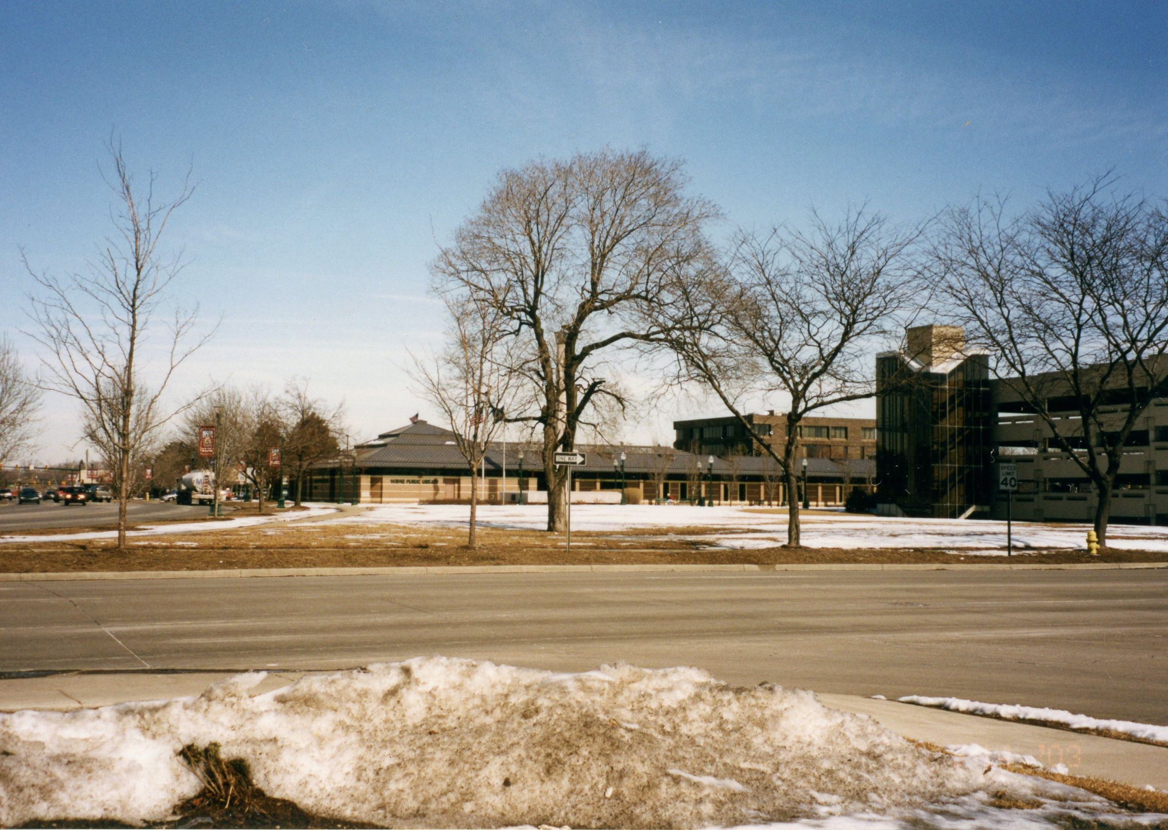 NE corner Wayne and Michigan Ave EB. 2003. Library and Parking Structure visible