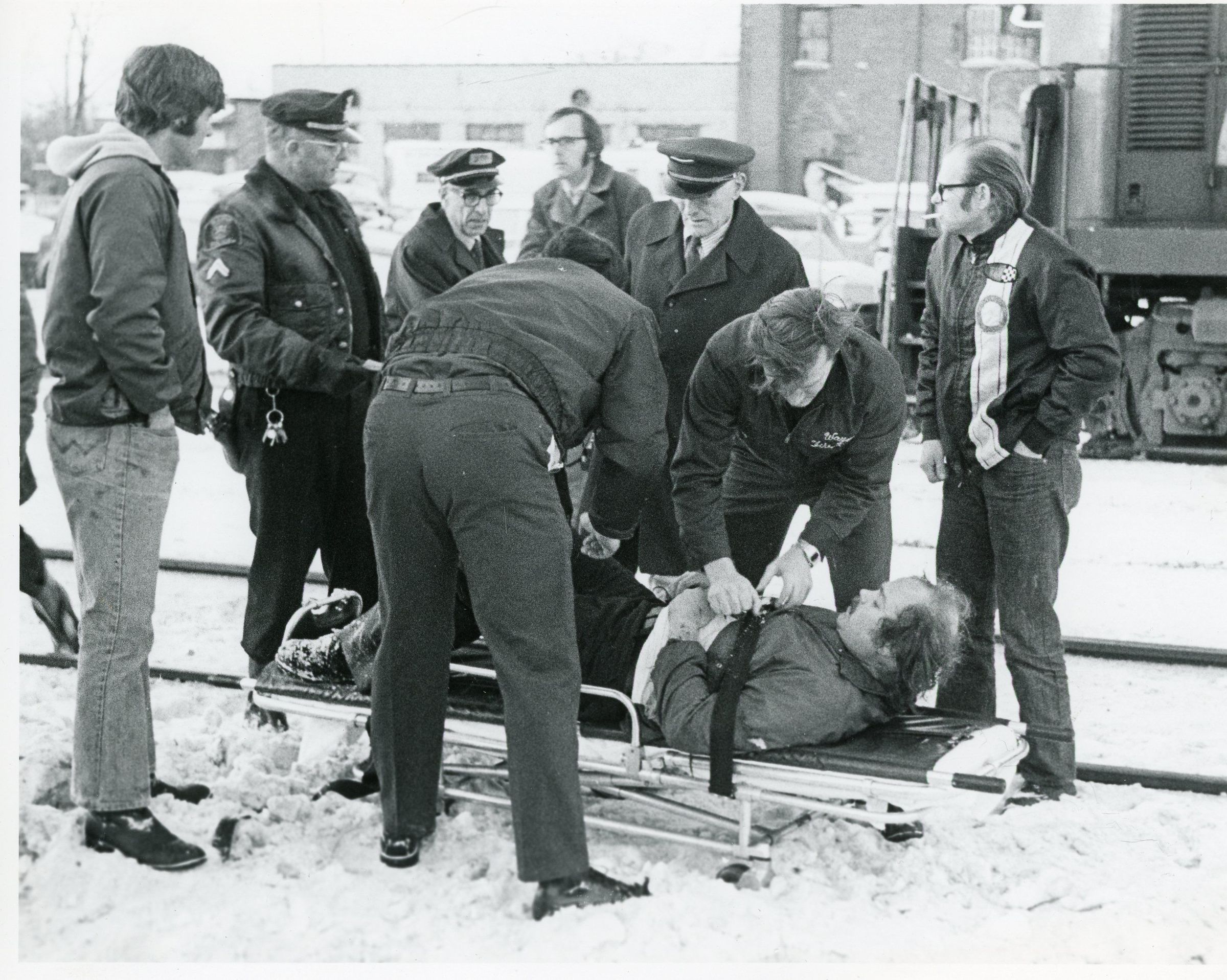 CPL William Biggerstaff at a train truck accident at the Pen Central railroad and Elizabeth St in the 1970's. Jan 16, 1976. Photo by Lothar E. Konietzko
