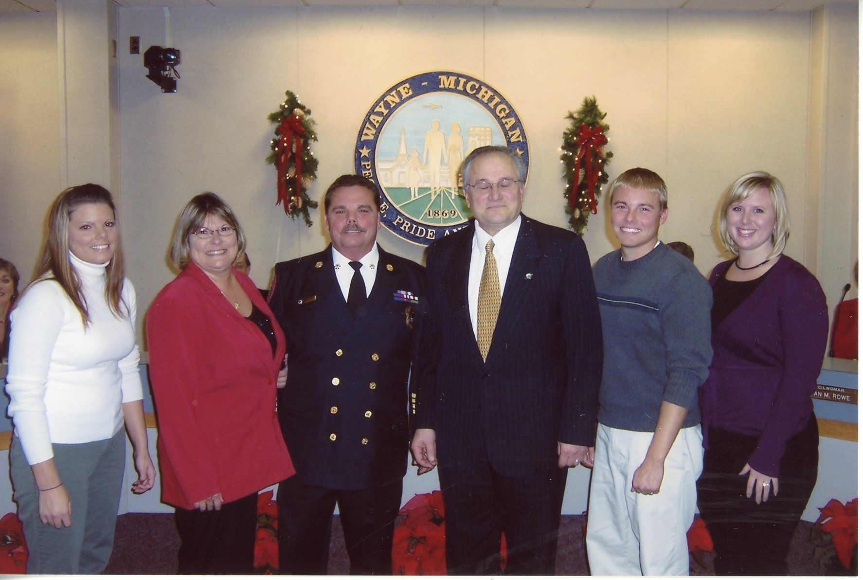 Fire Chief Moore with his family and Mayor Al Haidous standing to Moore's right. Pic taken in Dec 2008.Cataloged By