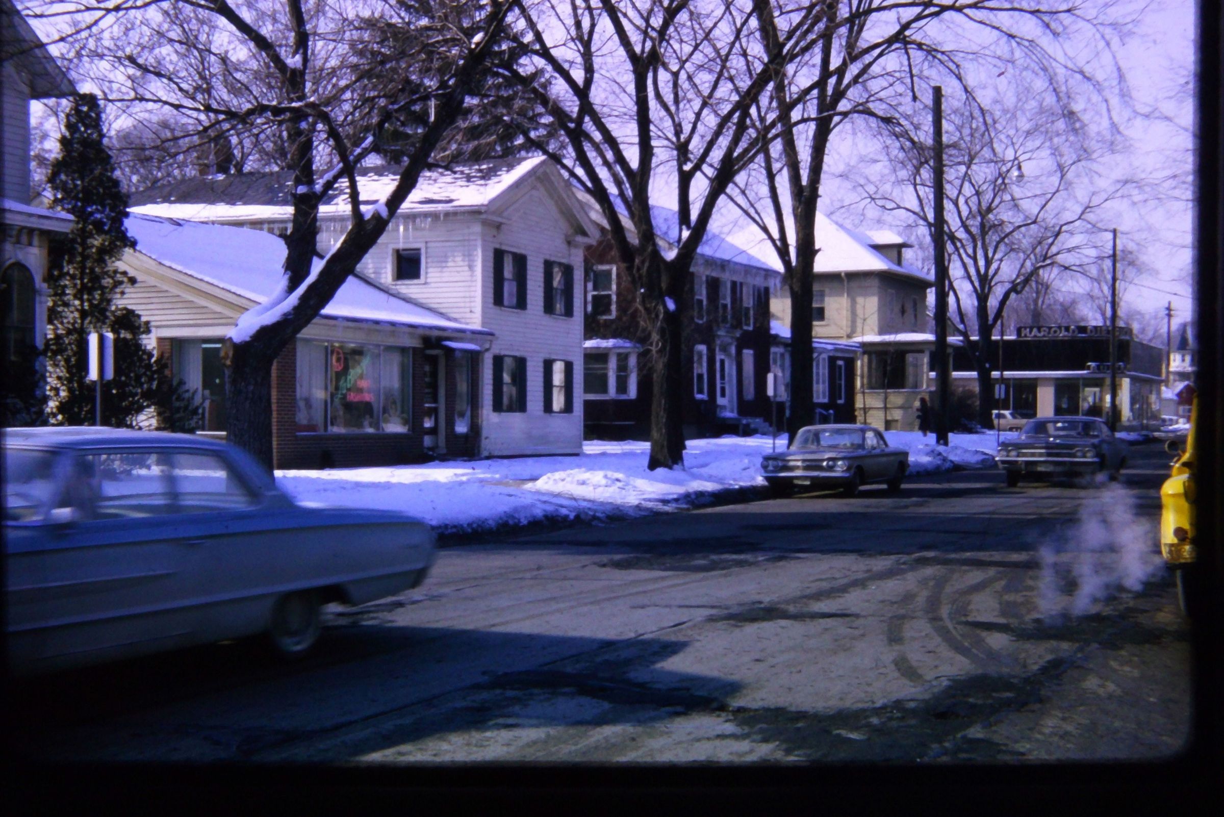 South side of Main Street looking SW towards Washington. 35015, 35029, 35033, 35043, 35100 Main. Harold Dietrich Dealership at SW corner Main and Washington. 1964. Pre Urban RenewalCataloged By
