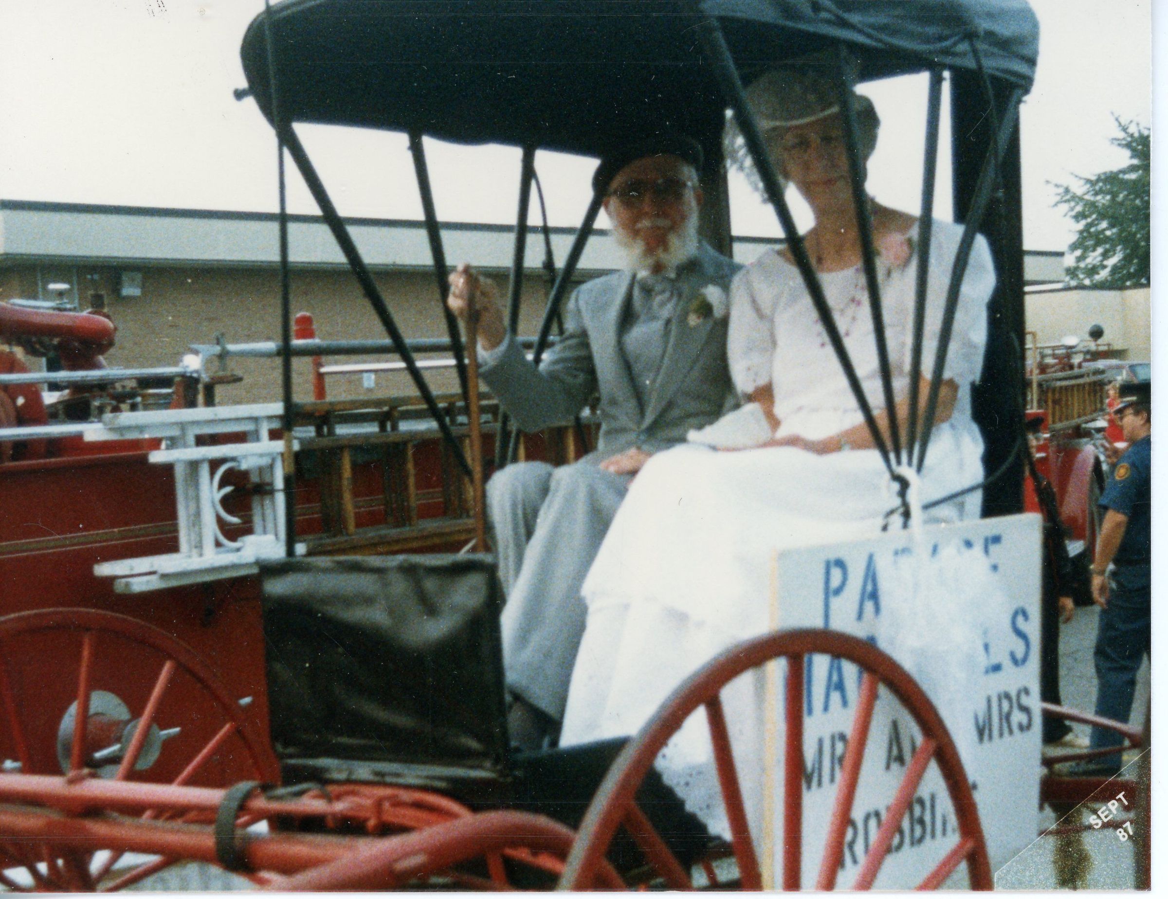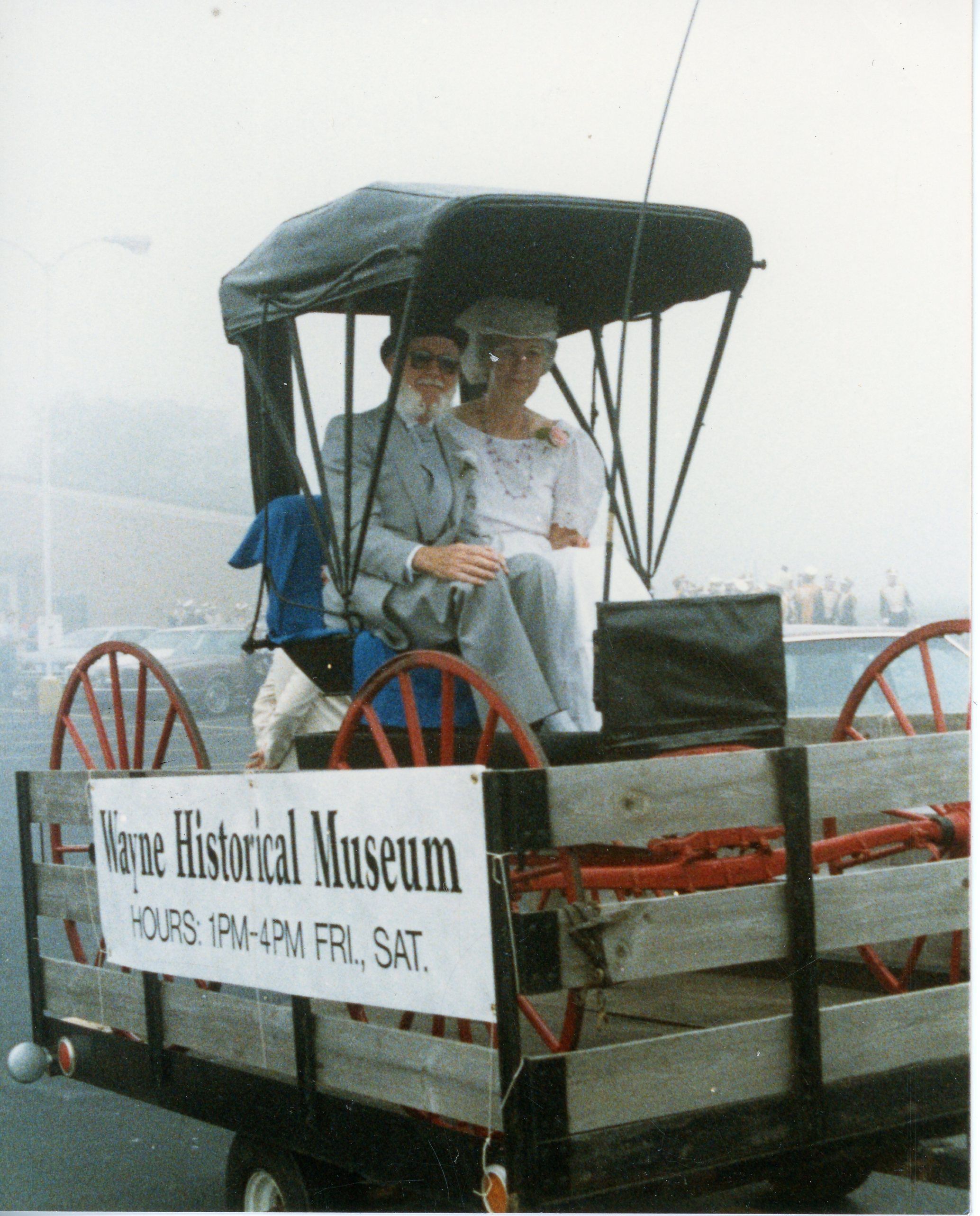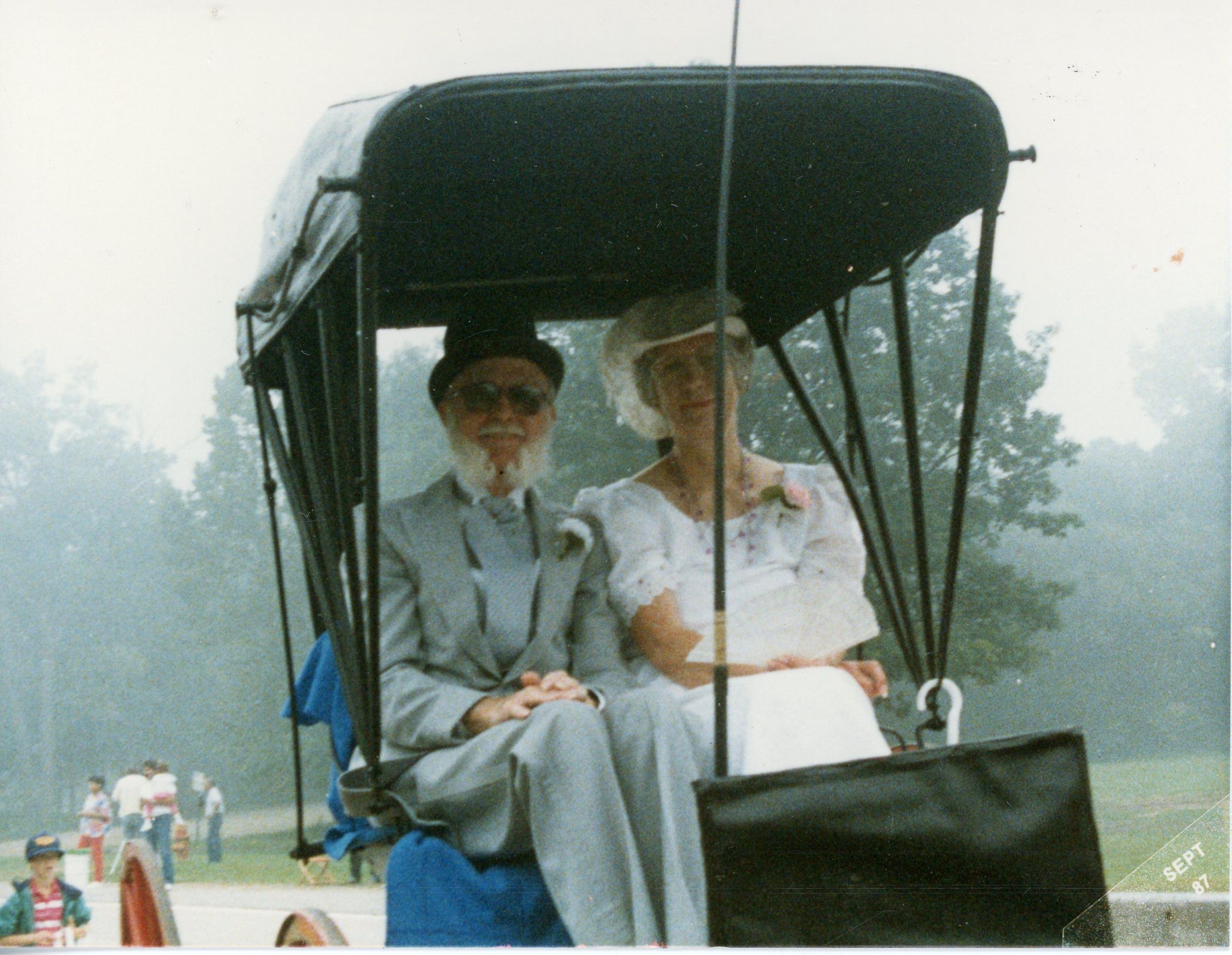 Sesquicentennial Parade 1987. Mr and Mrs Braxton Robbins. 9-5-1987. In Museum Carriage, Museum Float.