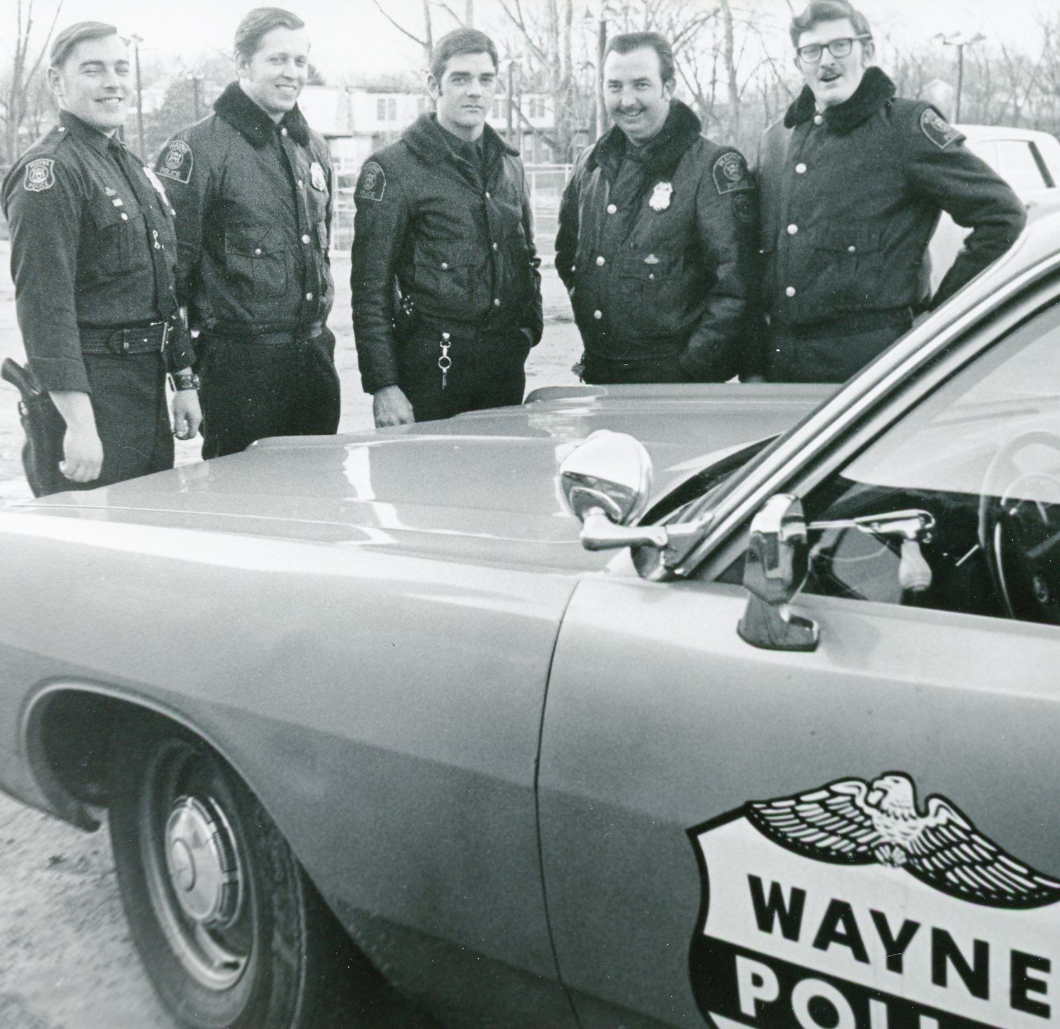 Wayne Police Officers Ken Beasley, Leonard Gerbowski, Michael Butler, Art Morton and Lee Balloue. Photo taken on Dec 31, 1971 by Lothar E. Konietzko for the "Eagle".Cataloged By