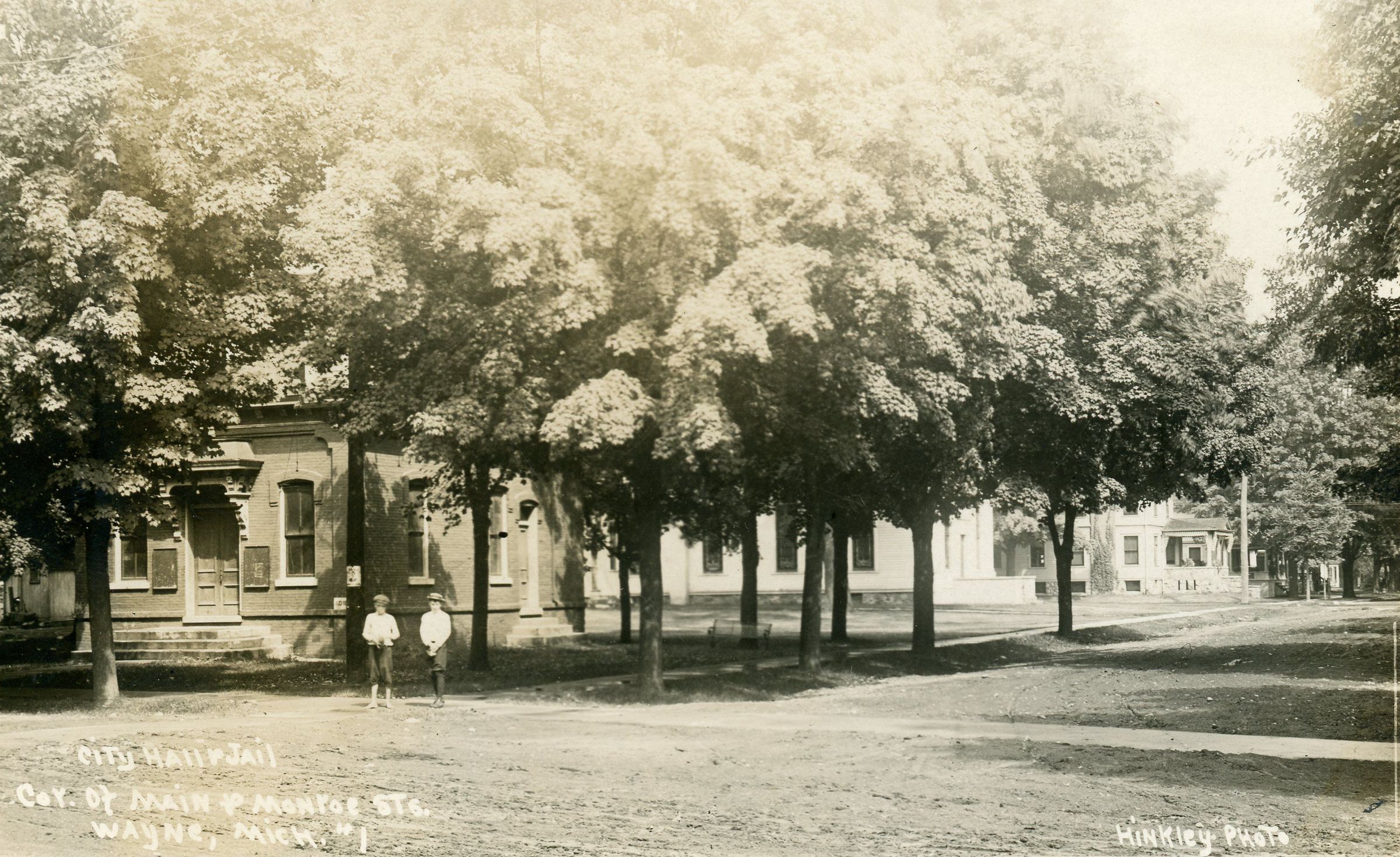 Intersection of Main, Biddle and Monroe, looking NE. Village hall at left, Congregational Church center.