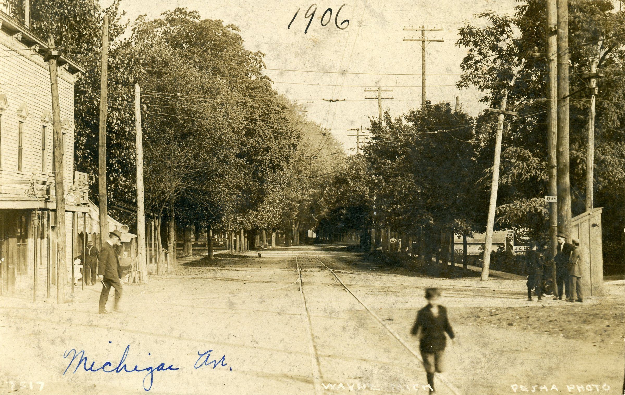 Michigan at Wayne road looking East. 1906. Varney Hotel on left. Streetcar tracks visible.