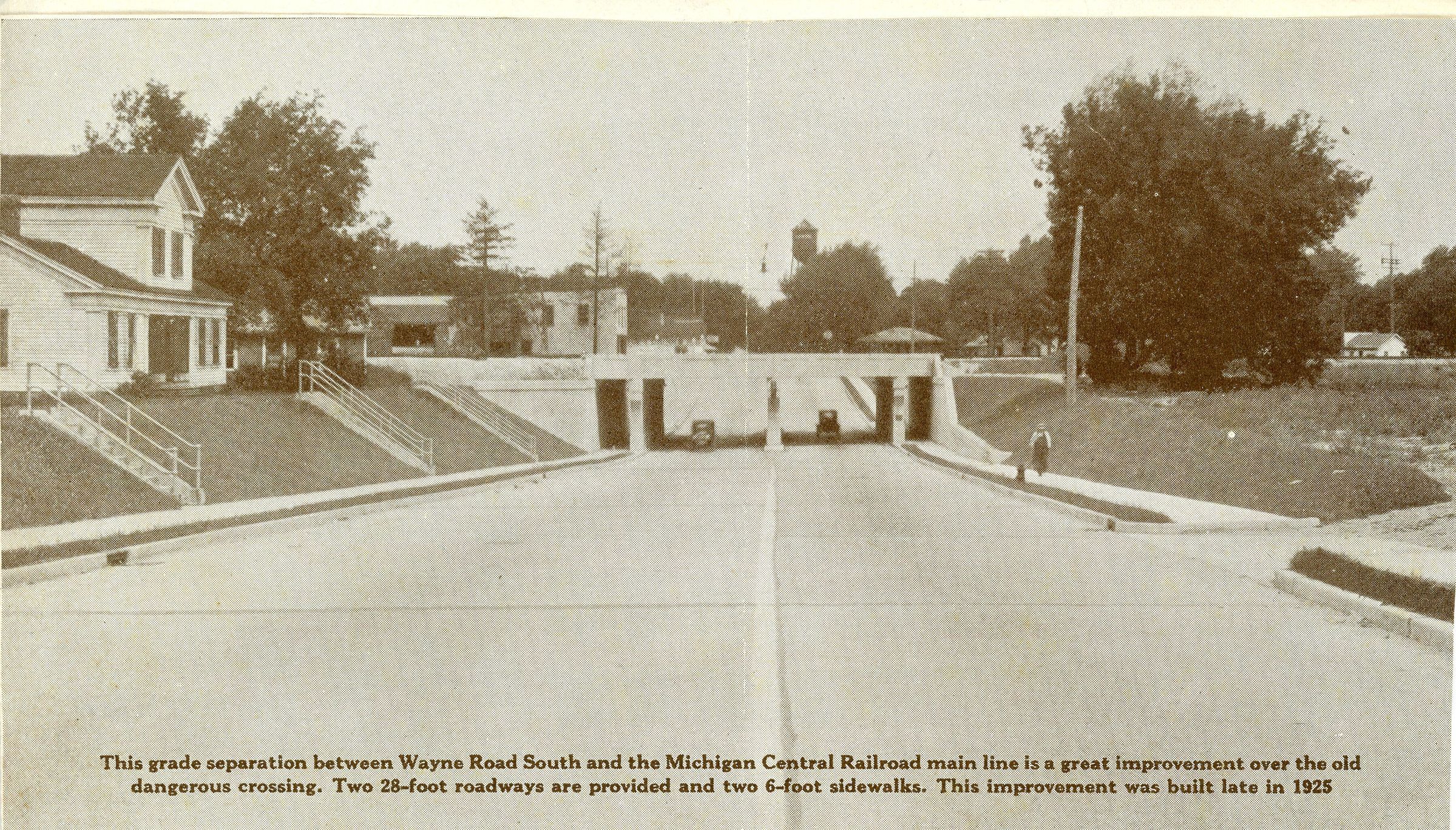 Wayne road at the underpass looking North. Built in 1925. Curtis house on left