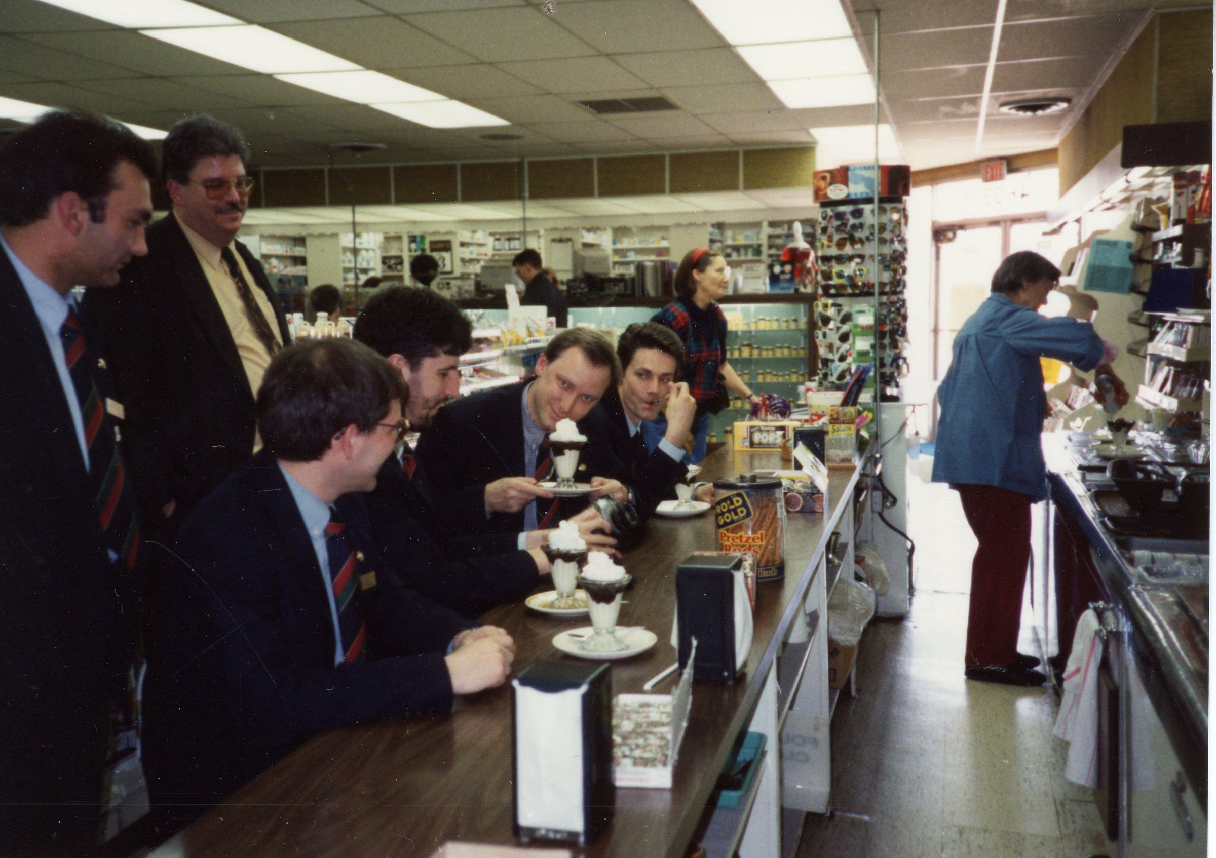 Belgium group enjoying ice cream at Cobb's Pharmacy. One of their high points of their trips to Wayne. Cobb's Pharmacy was on the corner of Wayne Rd and Annapolis St.Cataloged By