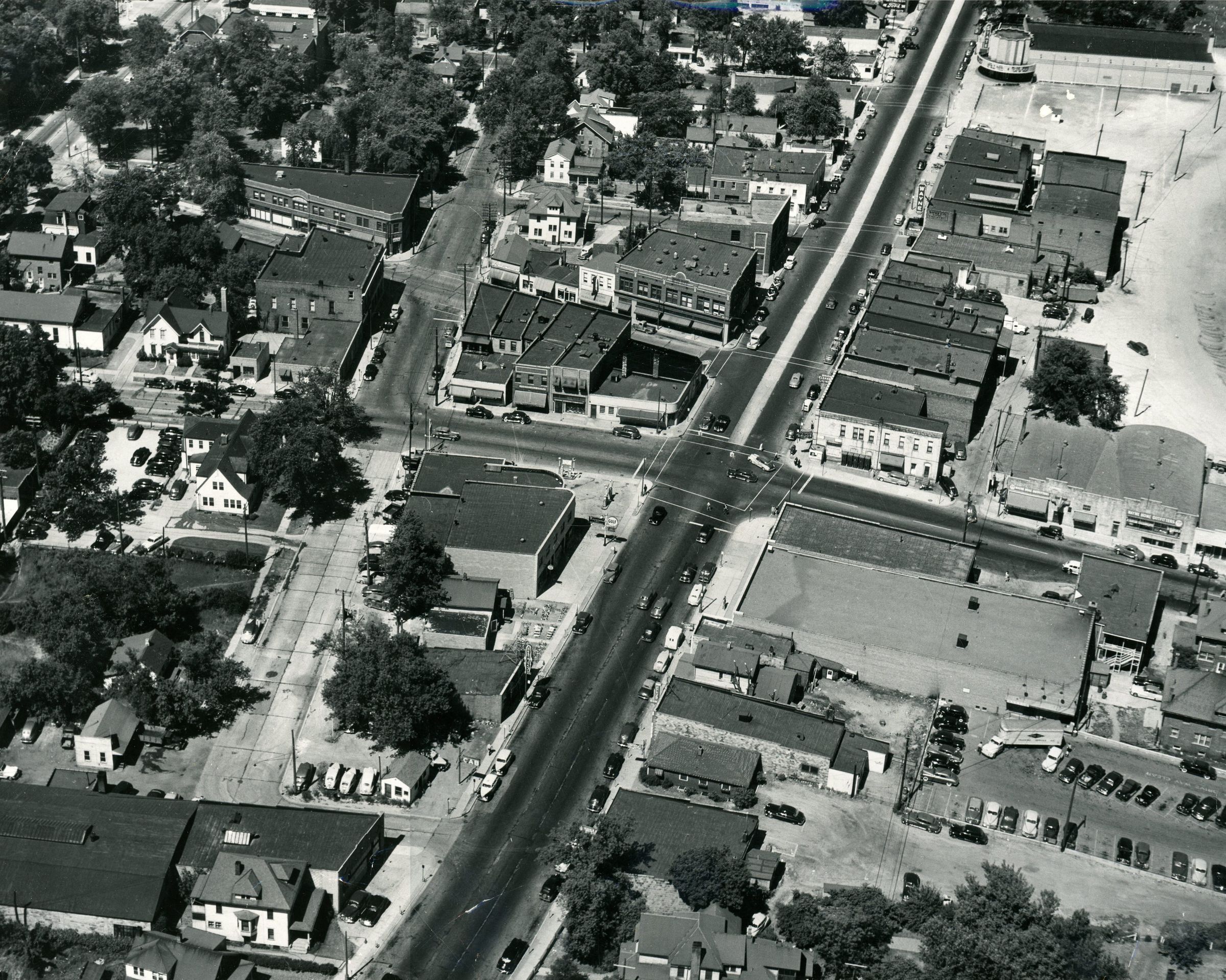 Over Wayne road and downtown looking West. Pre Urban Renewal. State Wayne theater at top right. Michigan Ave is large central road running diagonal.Cataloged By