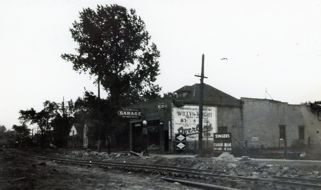 C.K. Miller Garage, 34869 Michigan. South side of Michigan west of Second, at Park. Photo is looking SE. Visible streetcar tracks.Cataloged By