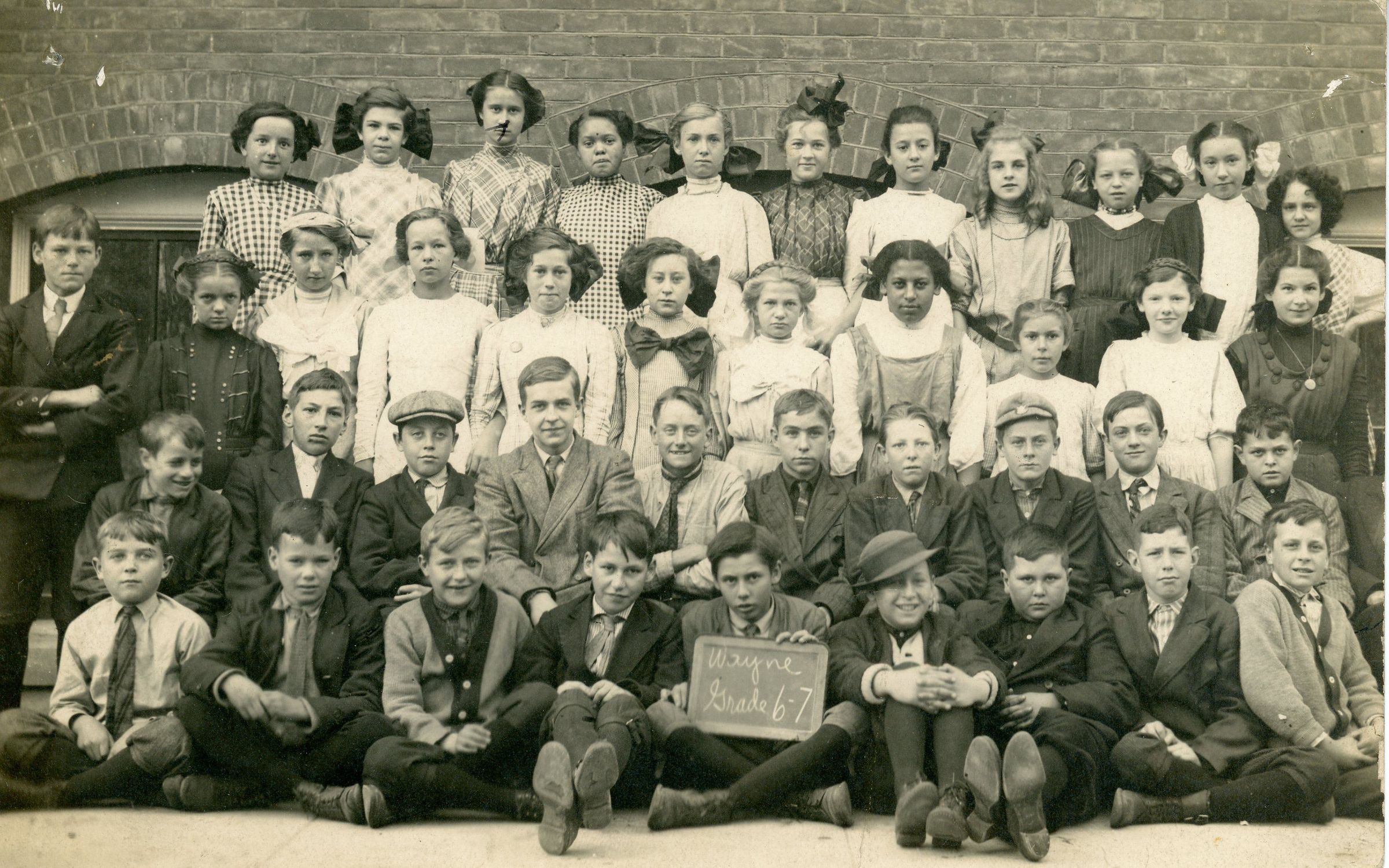 Wayne Grade 6-7 Back Row L to R: ?, Eugenia McNair (Prouty), Ruth Murphy, ?,?,P. Baece, ?,Kathleen Fitzgibbon, ?,? and Millie (Inkster). 2nd to Back Row L to R: ?,?,?,?,?, M. Yoeman, ?,?,?,Margueritte Kichen Morton and Elma Parke. 3rd Row from Back L to R: ?,?, Dwight Glover, Venoy Carpenter, ?,?,?,? and Jay Cozadd. Front Row L to R: Geo Glover, Merrill Bird, ?, Leslie Brown,?, Leo Moore,?,? and Hugo Gerbstadt in1900'sCataloged By