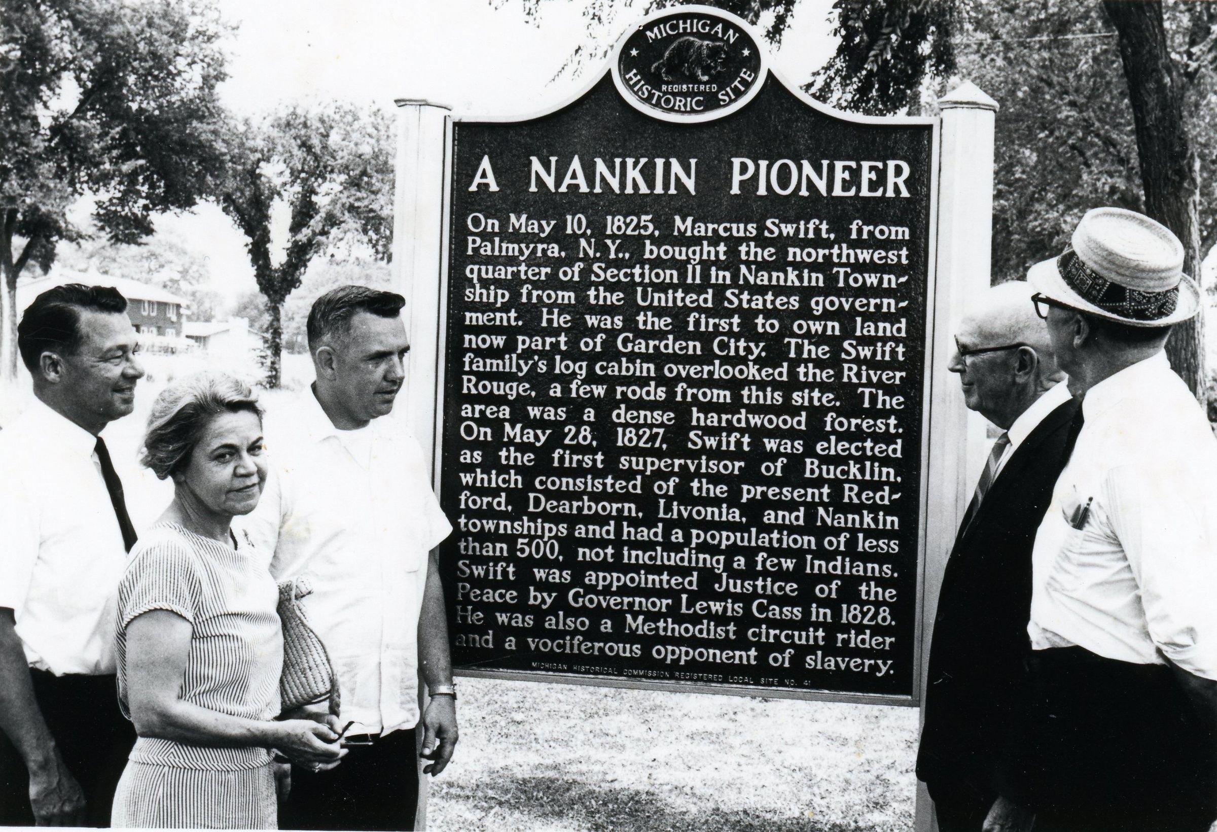 Dedication of Marcus Swift Historical Marker. June 1965. Douglas Waddell, Mrs. E.A. Chapham, Mayor E.J. Freeh, Lewis Vandervelde, John MacfieCataloged By