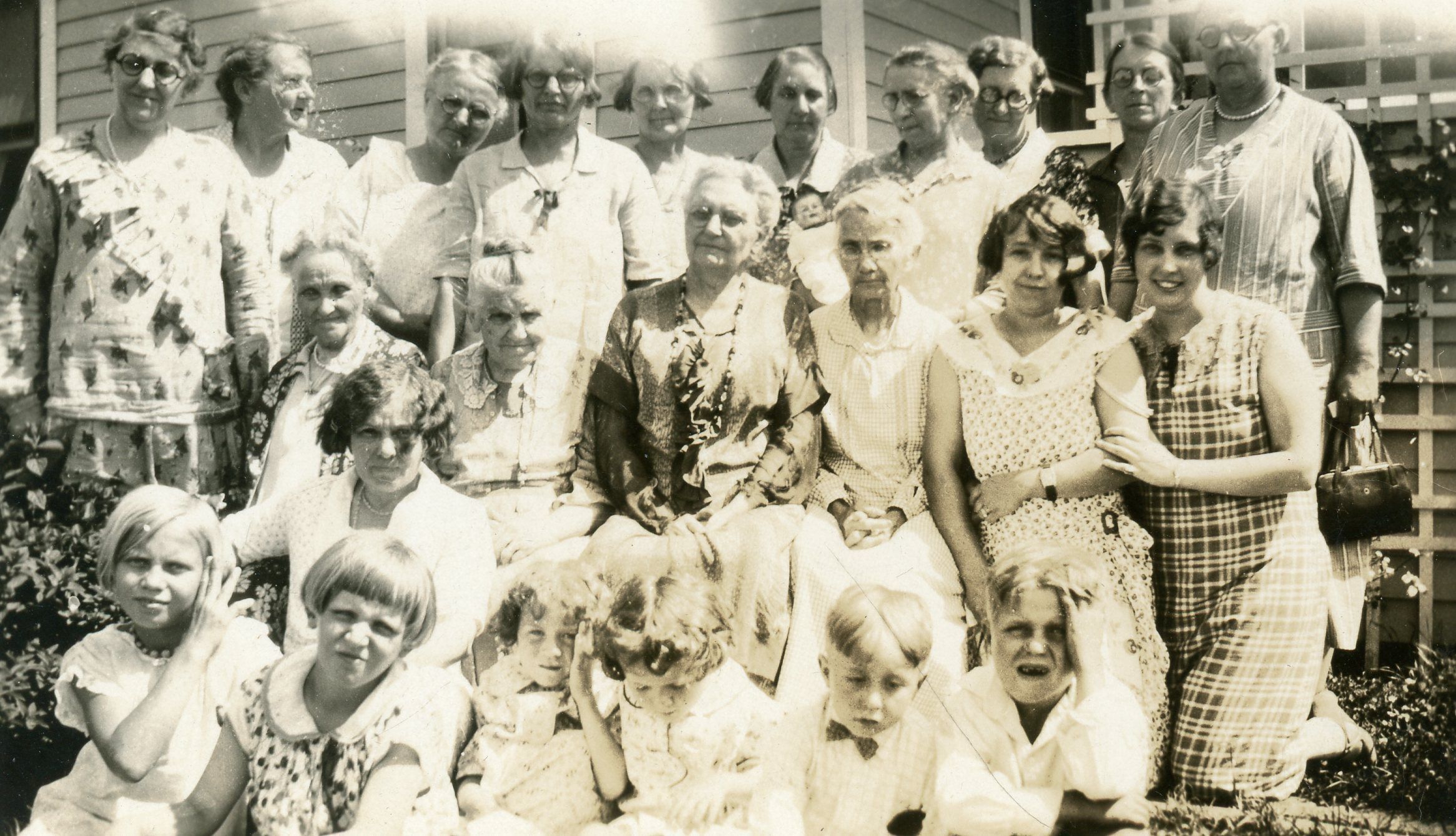 Front Row from Left to Right: ?, Winnifred Peters, ?,?,? and ?. 2nd Row: May Foster. 3rd row from Left to Right: Mary Hawley, Nettie Cady, Dena Smith, Mrs. Will Stevenson, Marion Zimmerman and Laura Butler. Back Row from Left to Right: Grace Peters, Mrs Nells. Mrs. Gelinski, Mrs. Gelinski's daughter, Laura Chambers, Ida Threadgold, Anne English, Hattie Norwood and Fanny Raymo. This photo was taken in the summer of 1928 at Mrs. Gelinski's home on Merriman Rd.Cataloged By