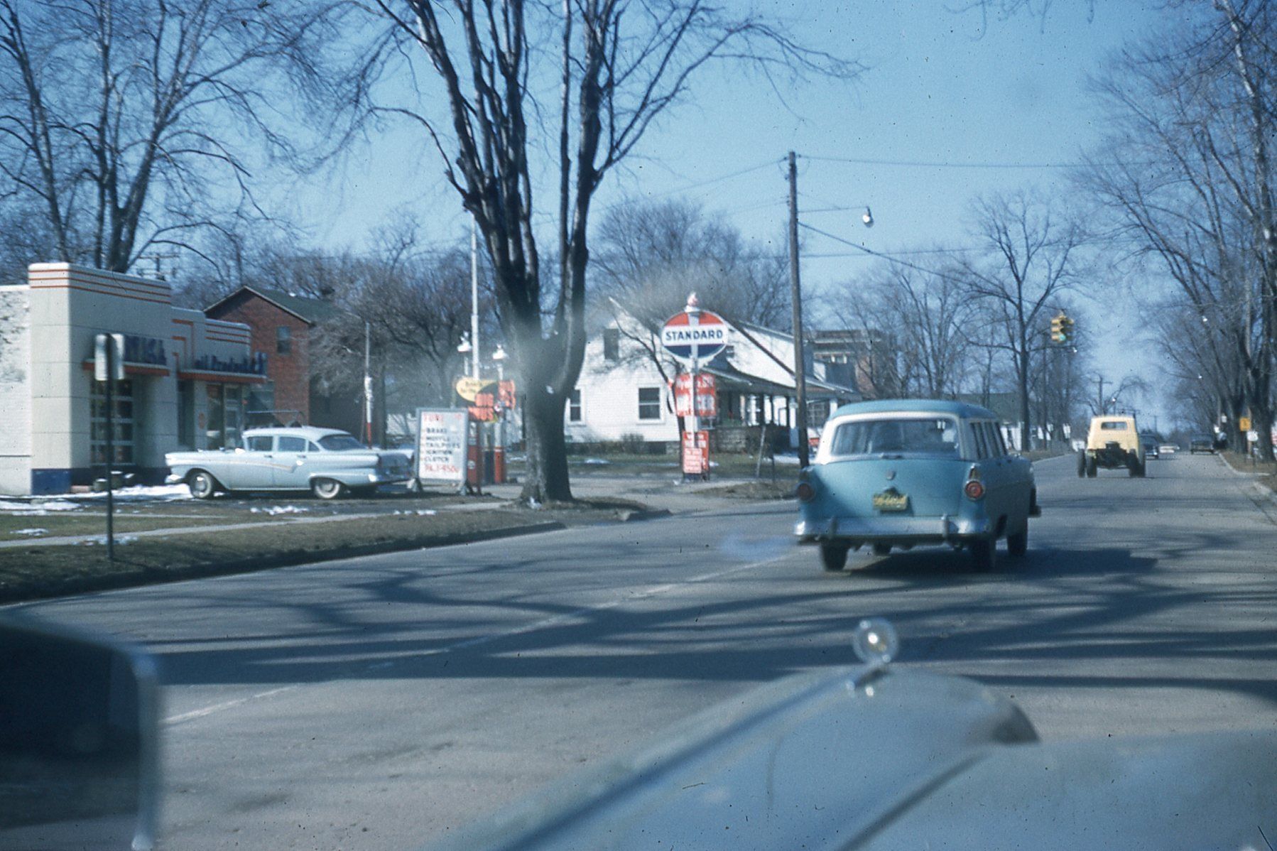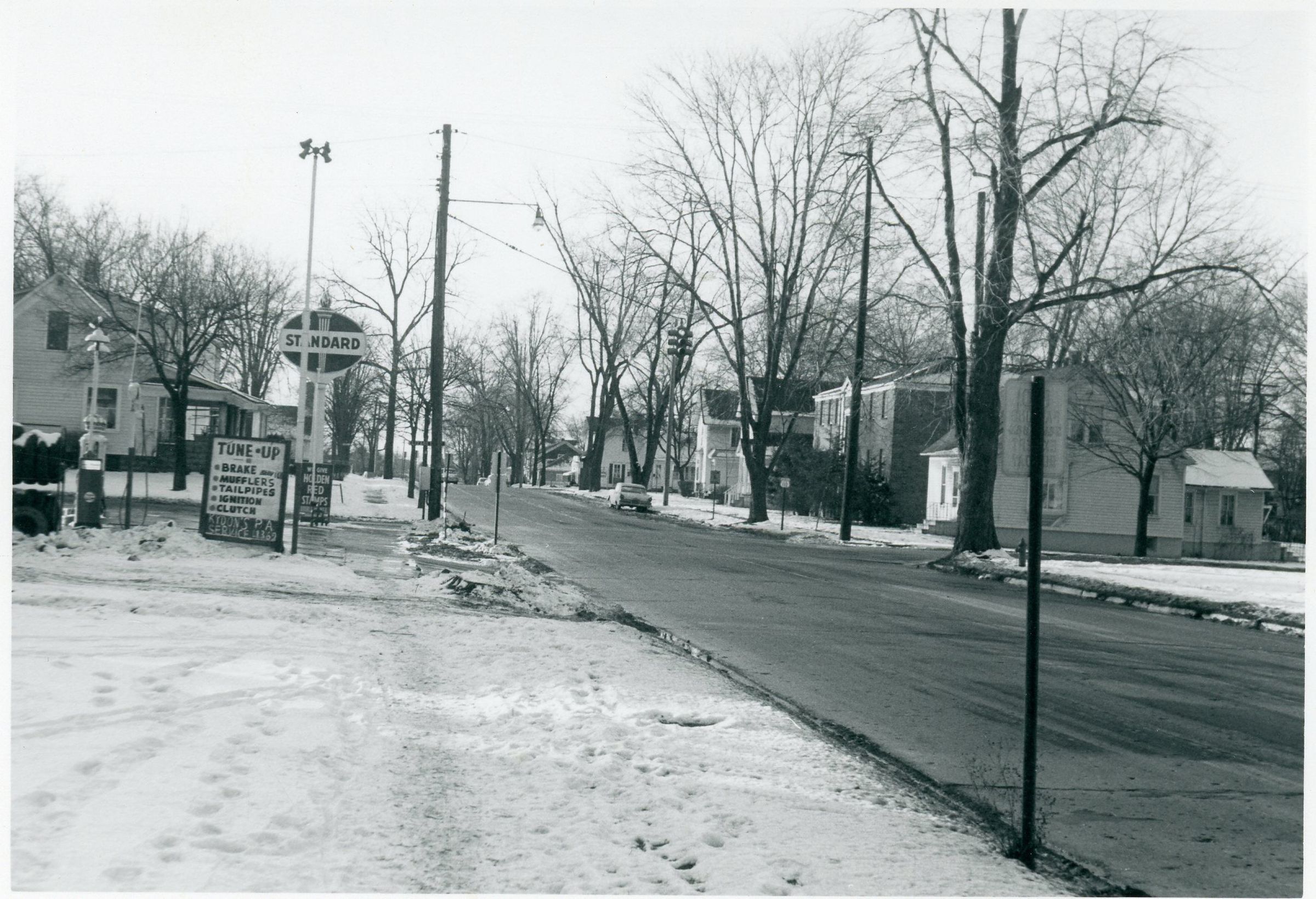 Main looking West through Elizabeth. Tramp Arthurs Standard gas station at left. (gas station at SE corner main and Elizabeth)Cataloged By