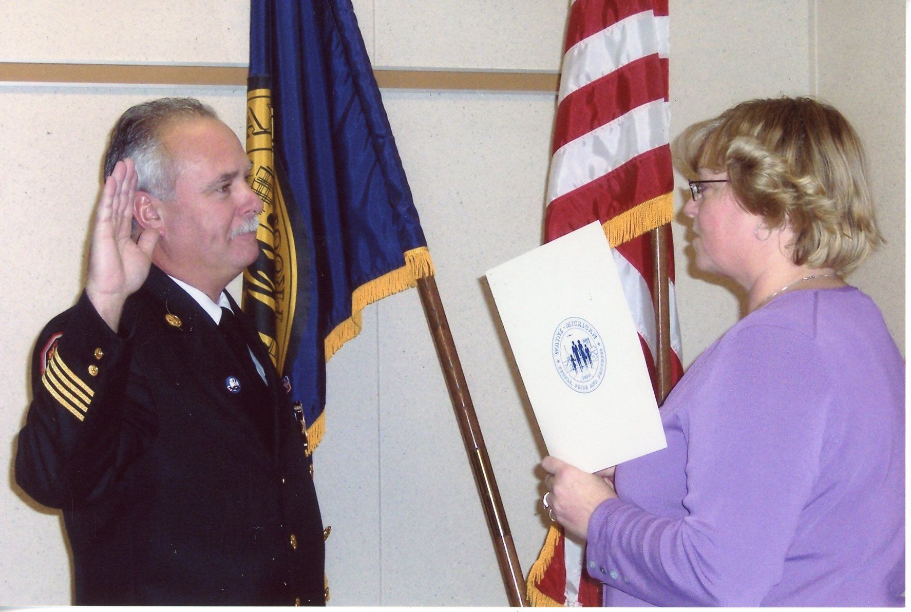 Deputy Chief Mike Mckee getting sworn in by City Clerk Mary Carney in 2008.