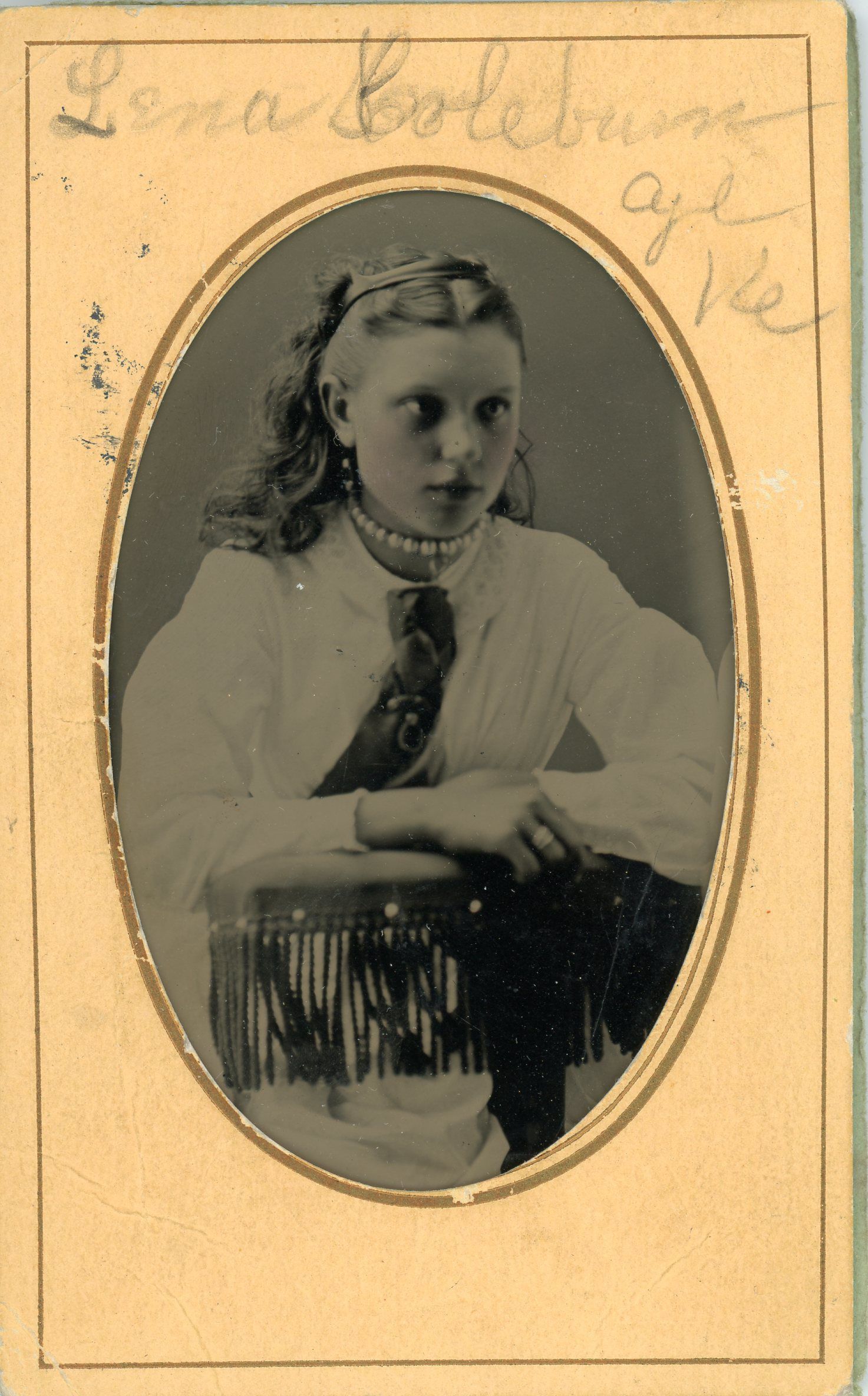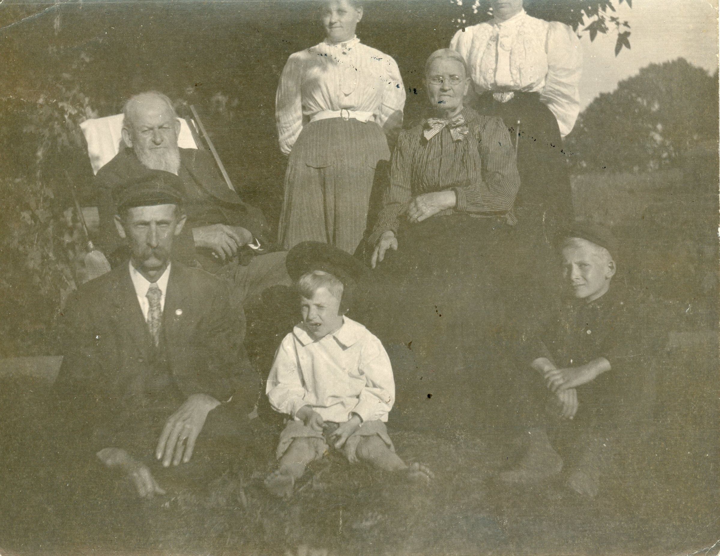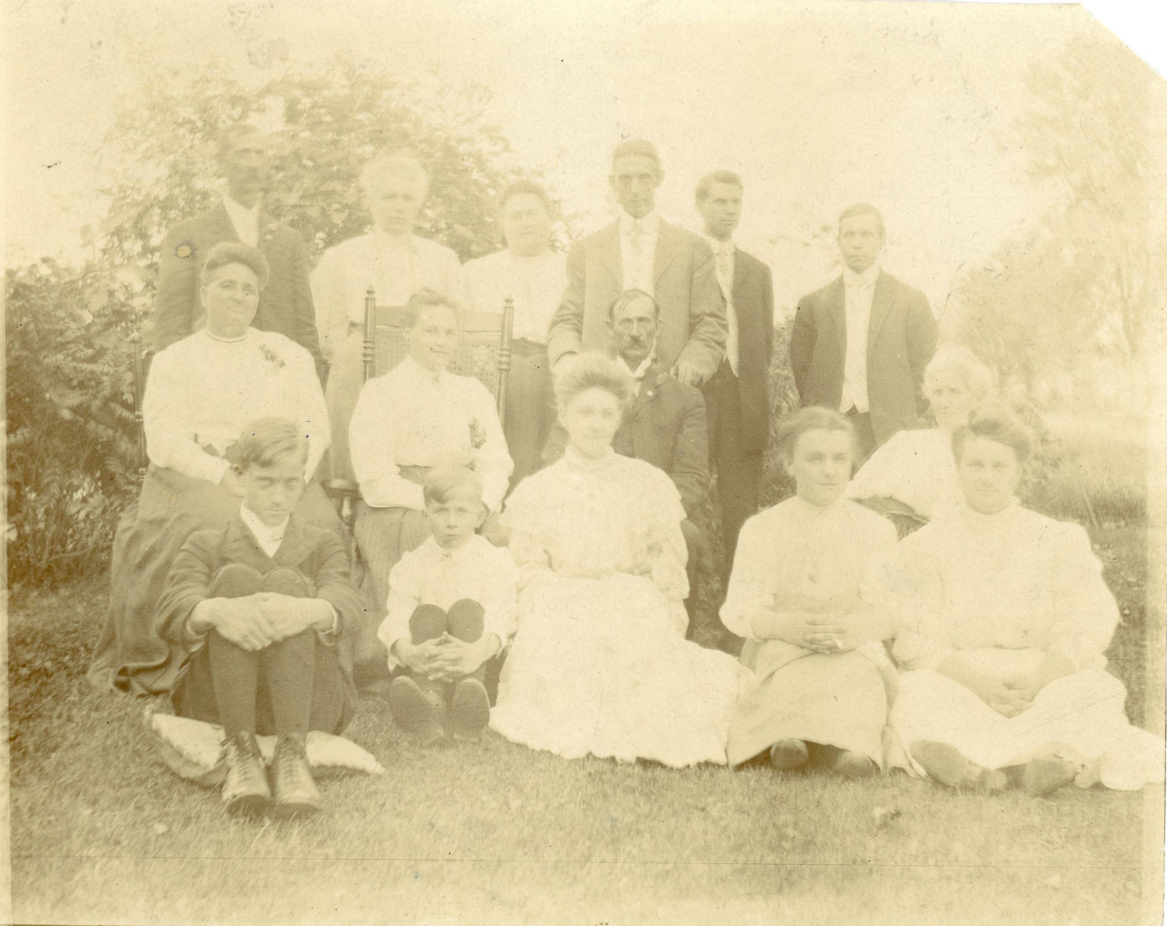 Coleburn Family Last Photo. 1st row L to R: Earl and Charlie Smith, Grace Smith, Lena Chambers and Nellie Smith. 2nd Row L to R; Dorcas Scott, Mary Hawley, Will Smith and Lila Smith. 3rd Row: Joe Smith, Lena Smith Rose Burgess of Cali, Harry Peters, Will Wilson and Glenn Smith. John Burgess took photo in front of Will Smith's House. Which stood next to Gus Thompson. East of Pere Marquette R.R where Gar woods stood, near M.C.R.R.Cataloged By