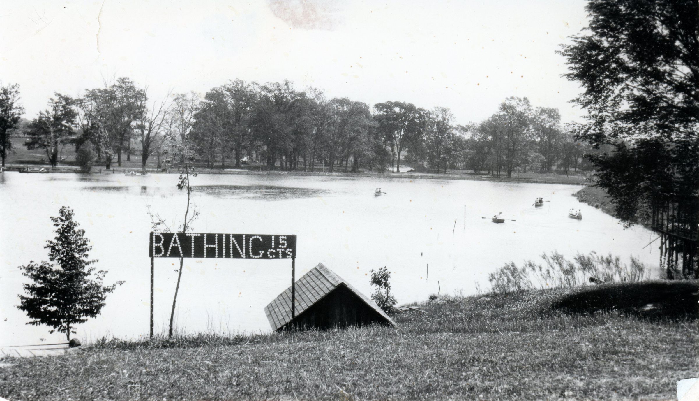 Carpenter Lake. Bathing 15 cents. Pumphouse center. Bathhouse on right. People on lake canoeing. 1932.