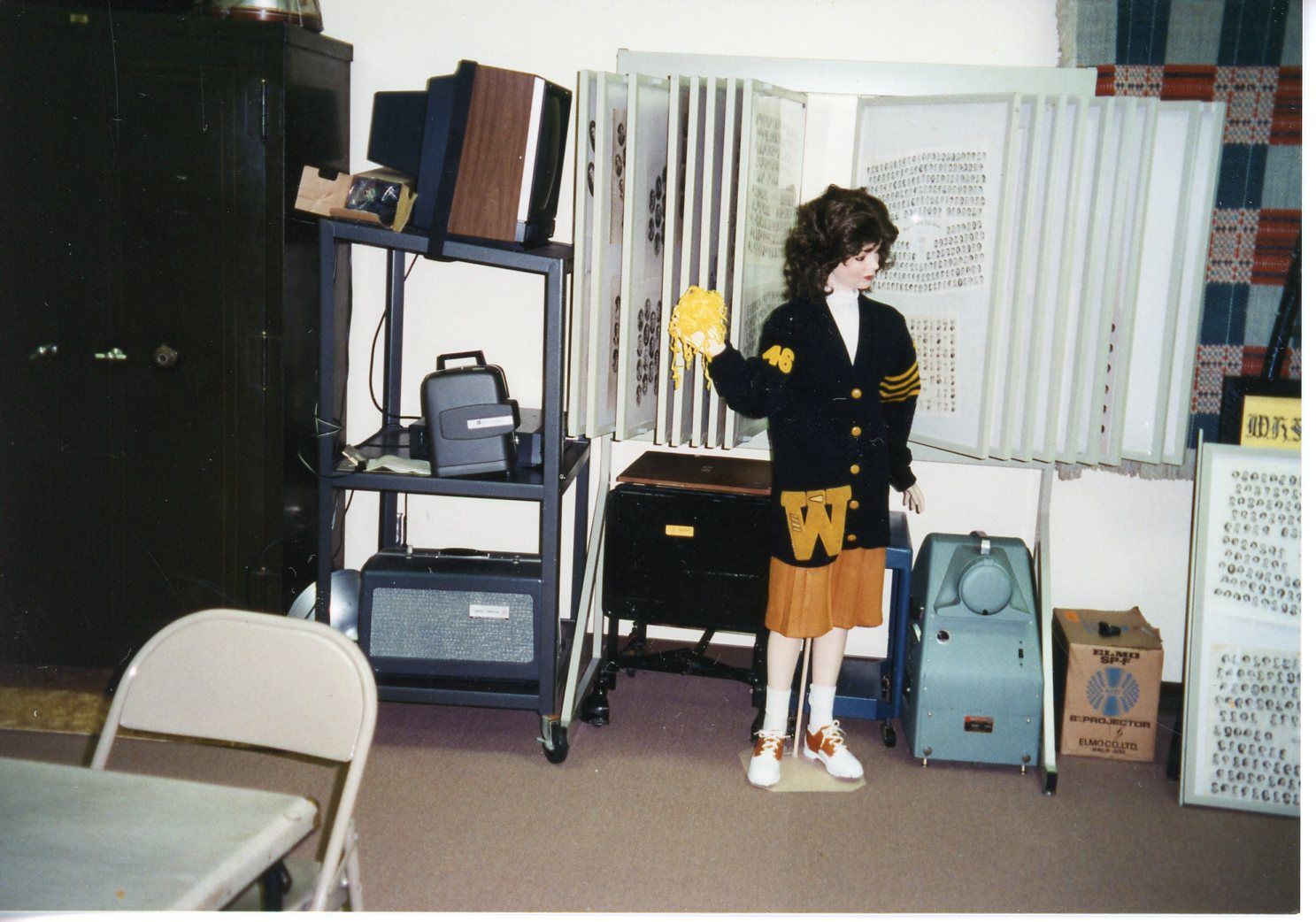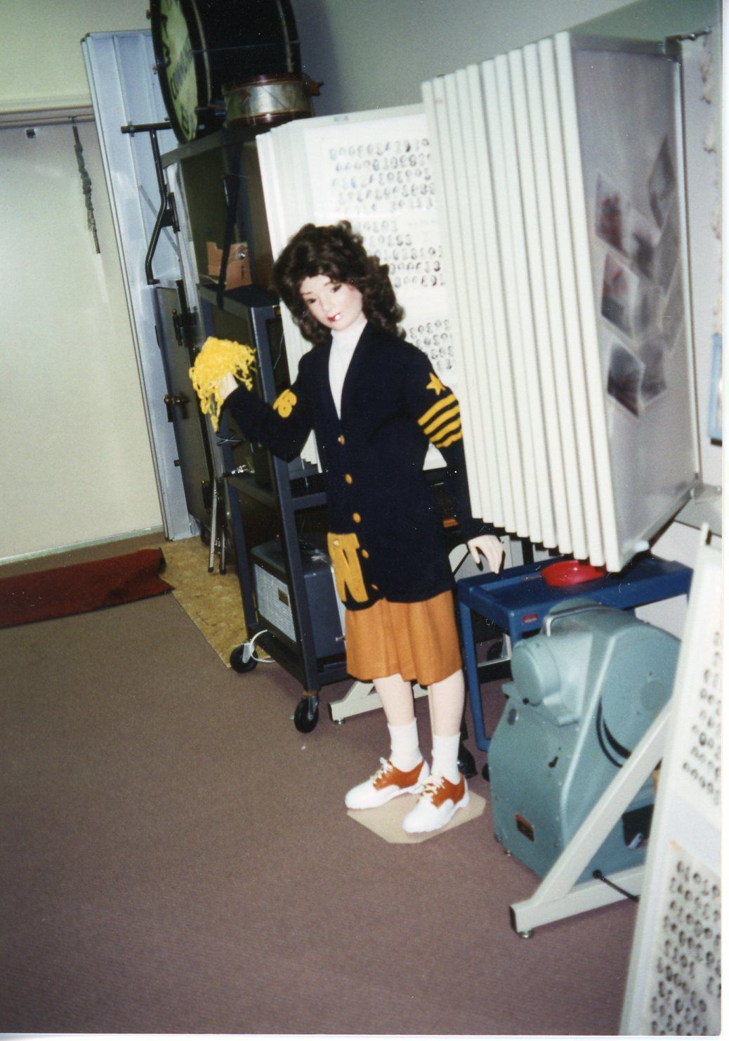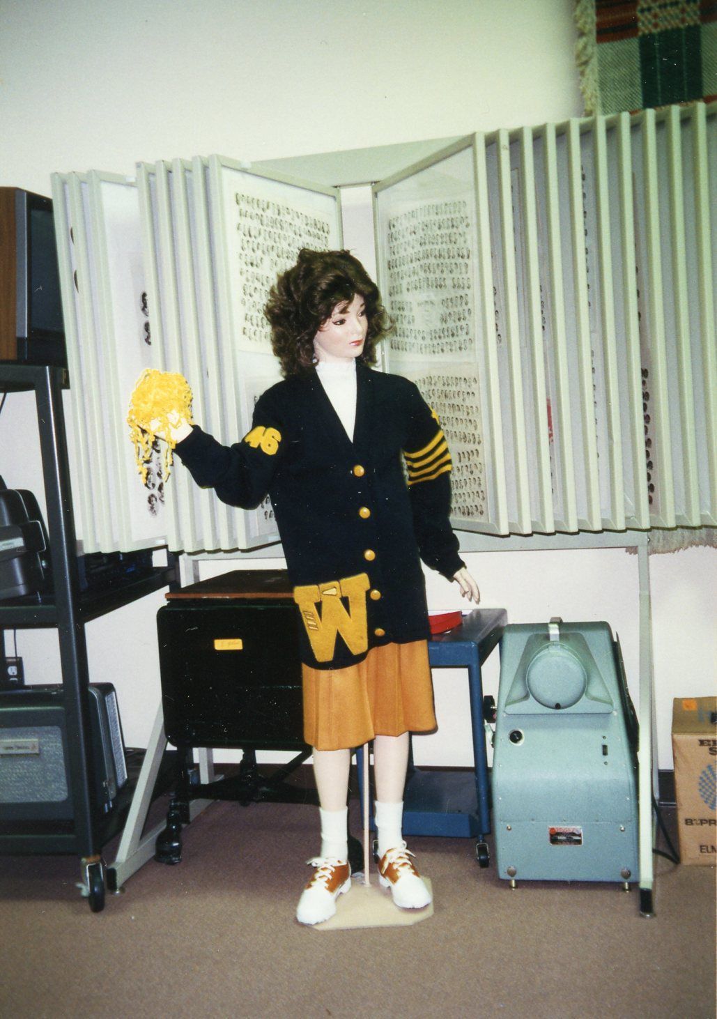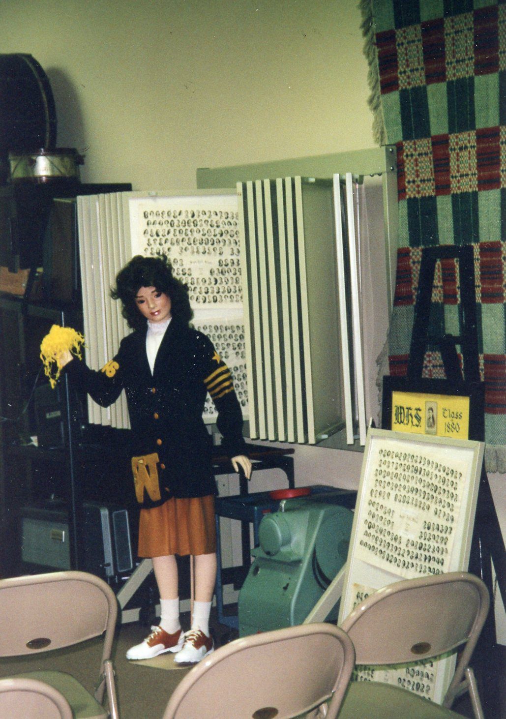 Wayne High Display showing 1946 Wayne High Cheerleader outfit on mannequin. Sweater donated by Jane Schneider.