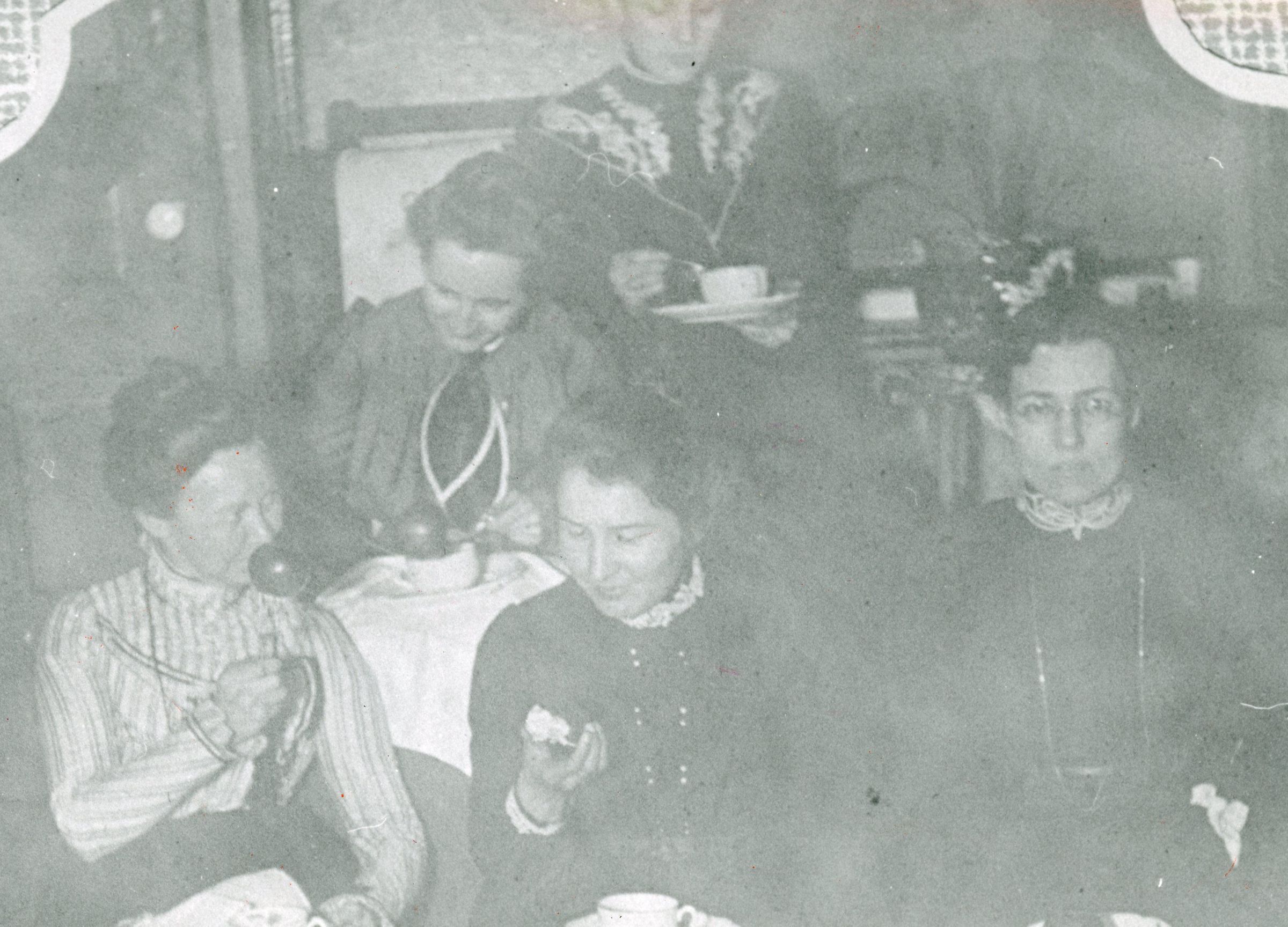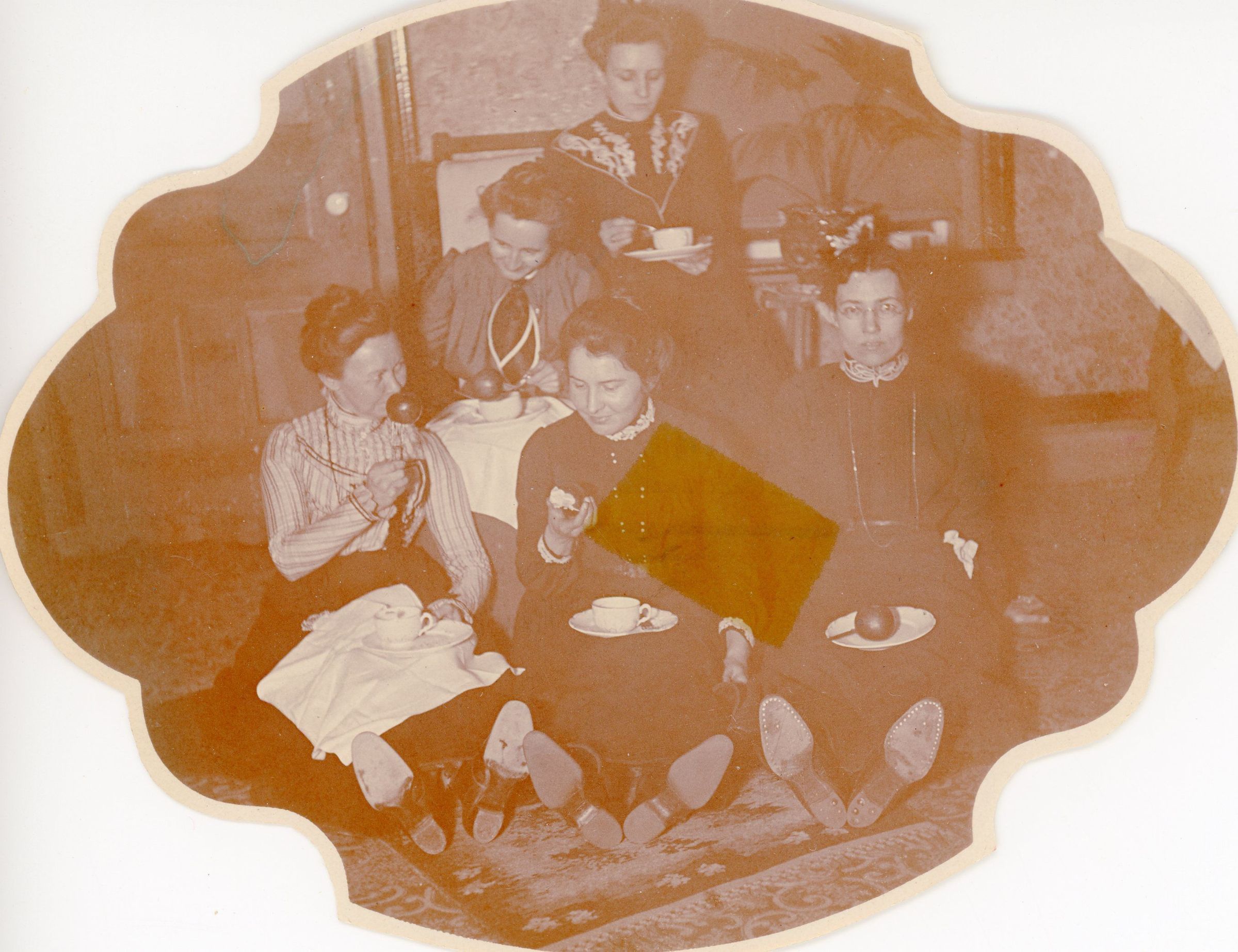 In back is Alice Cady. In the middle is Emma John. In the front row, from left to right: is Ida Collar, Floy Warner and Mammie Chaffee of the Spinster Club. They are eating candy apples.Cataloged By