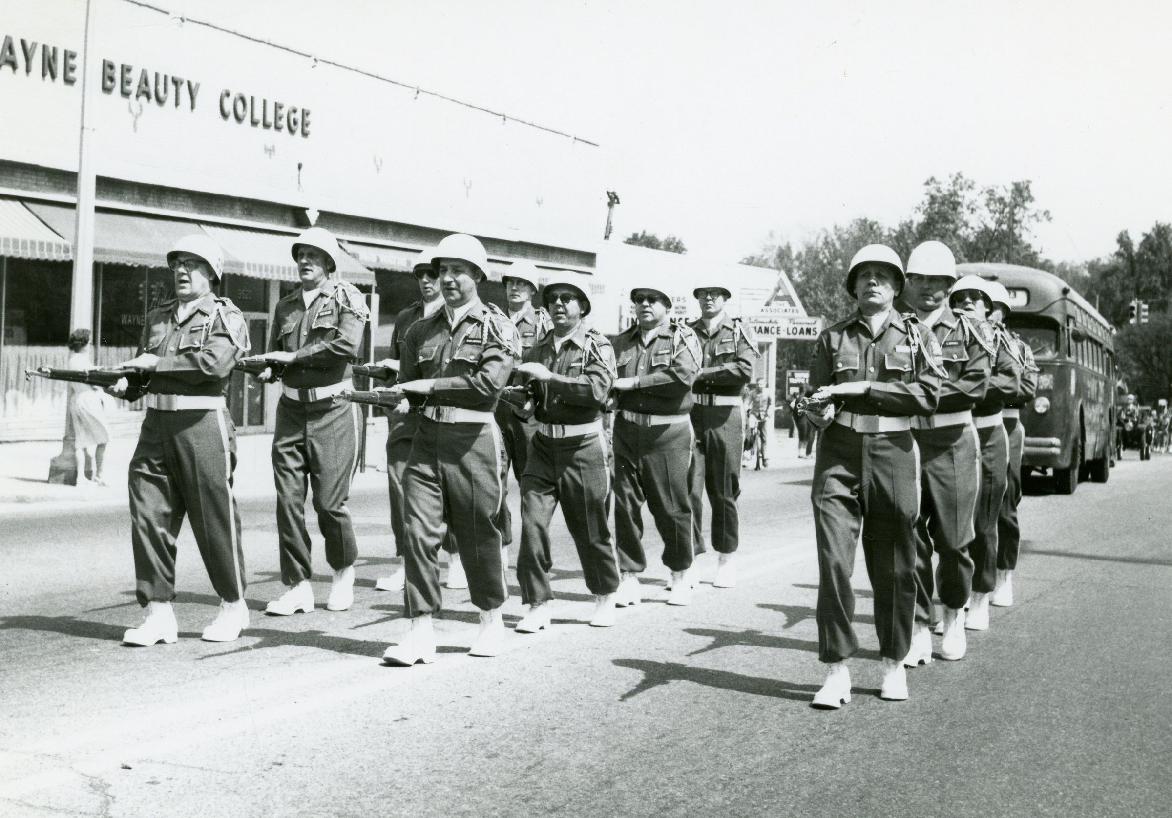 Memorial Day Parade - VFW Drill Team. Wayne road, Wayne Beauty College at left.
