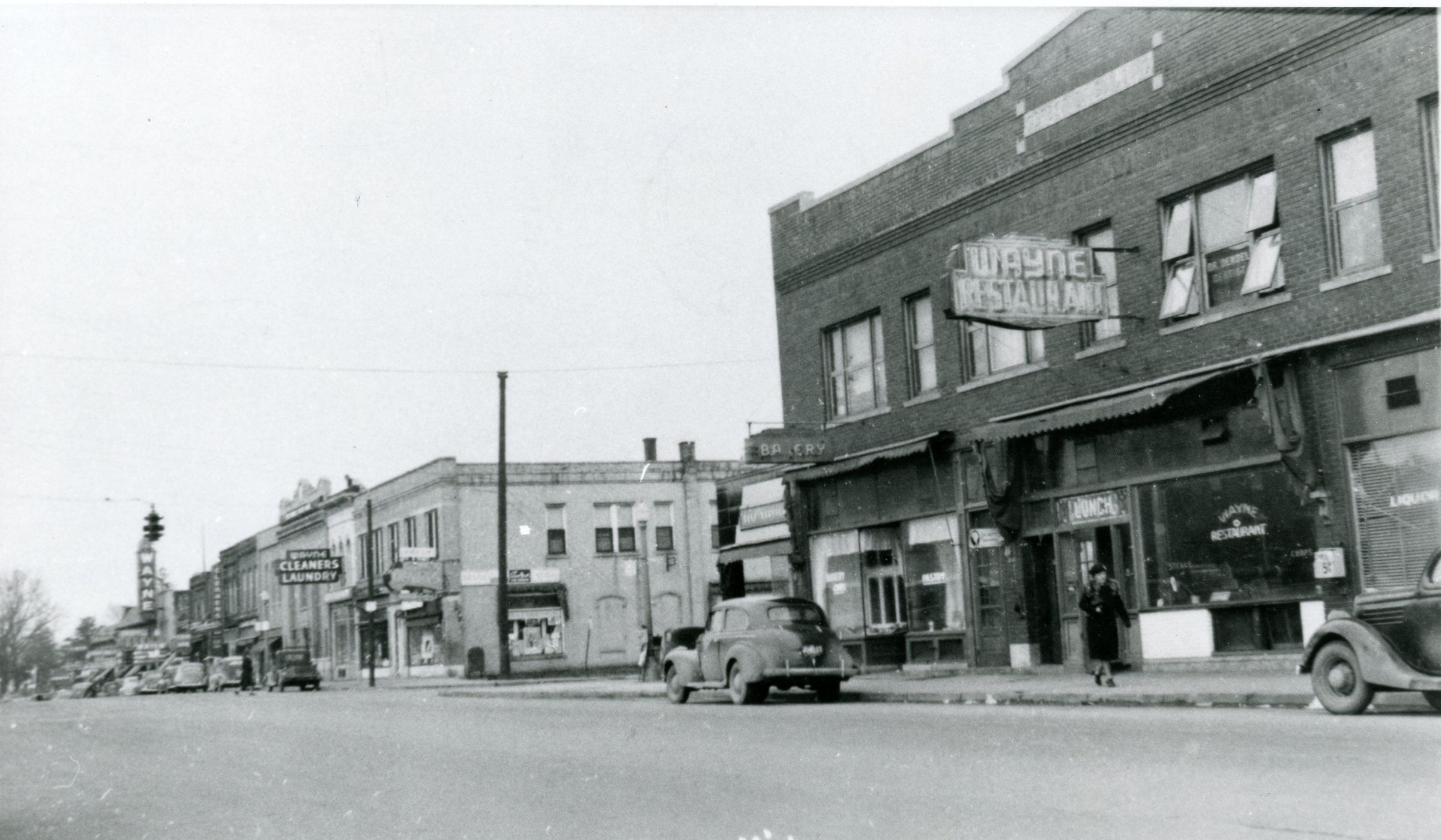 Michigan Avenue looking NW towards Wayne Road. Gerbstadt building on right, Wayne restaurant, Gerbstadt Bakery. Bank block in background. c. 1946.Cataloged By