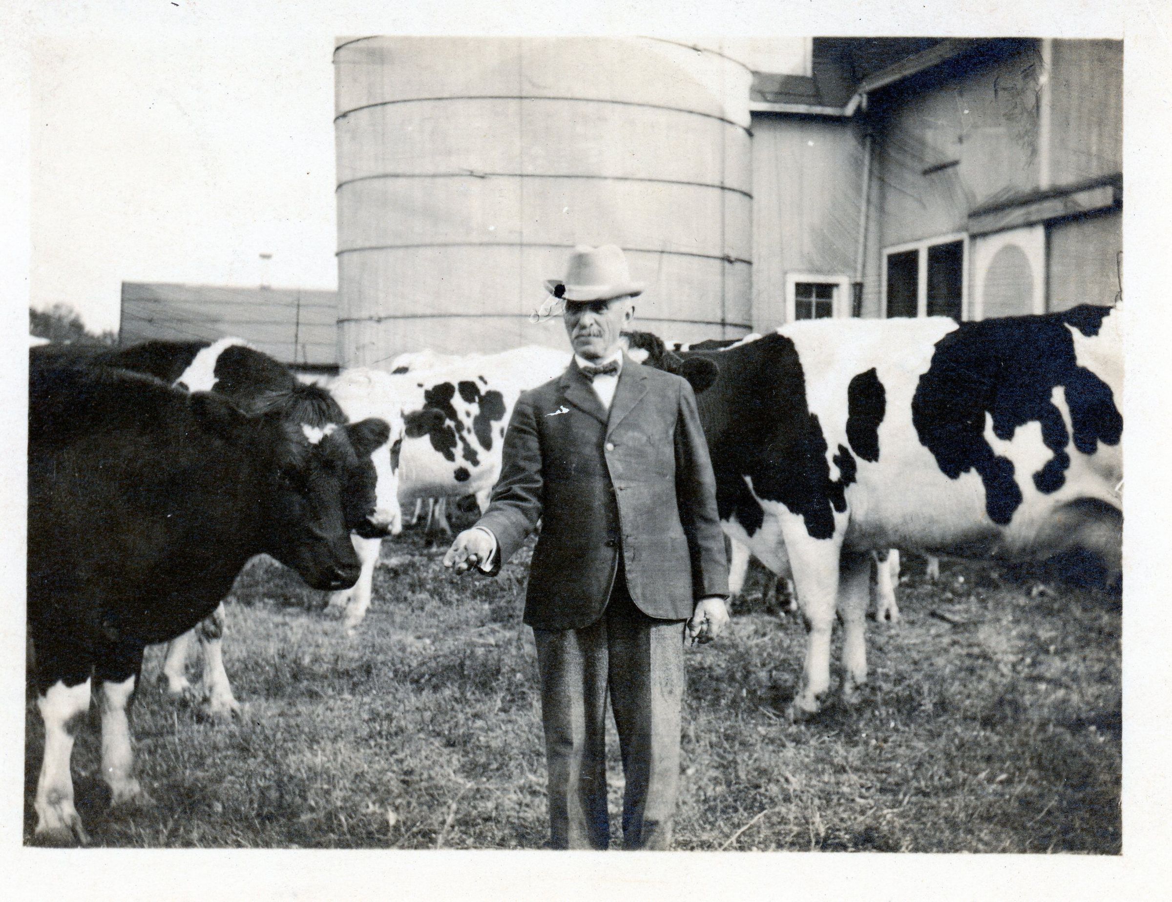 John C. Stellwagen and his cows, likely at his Belleville farm, Huron Hill Farm.