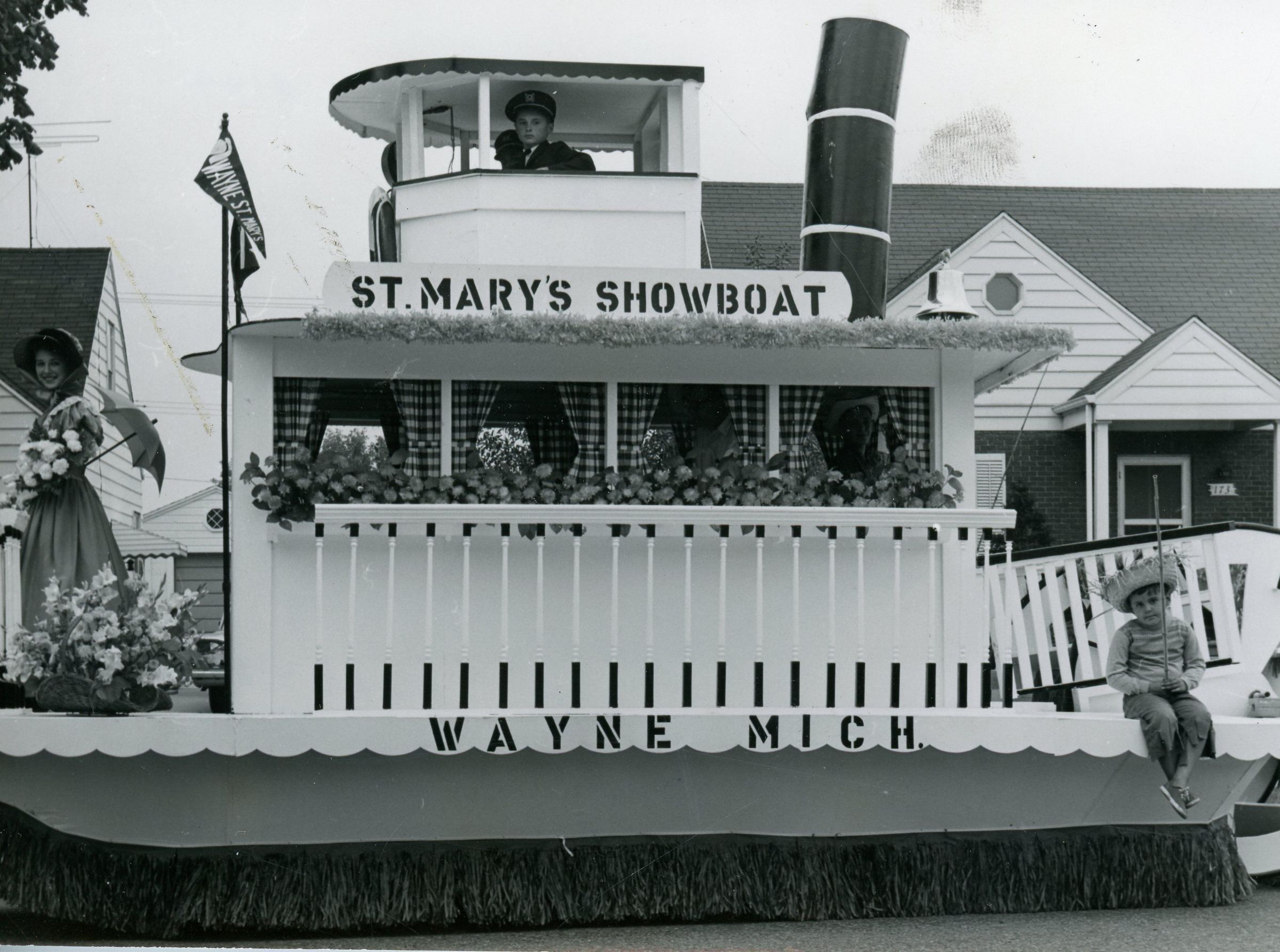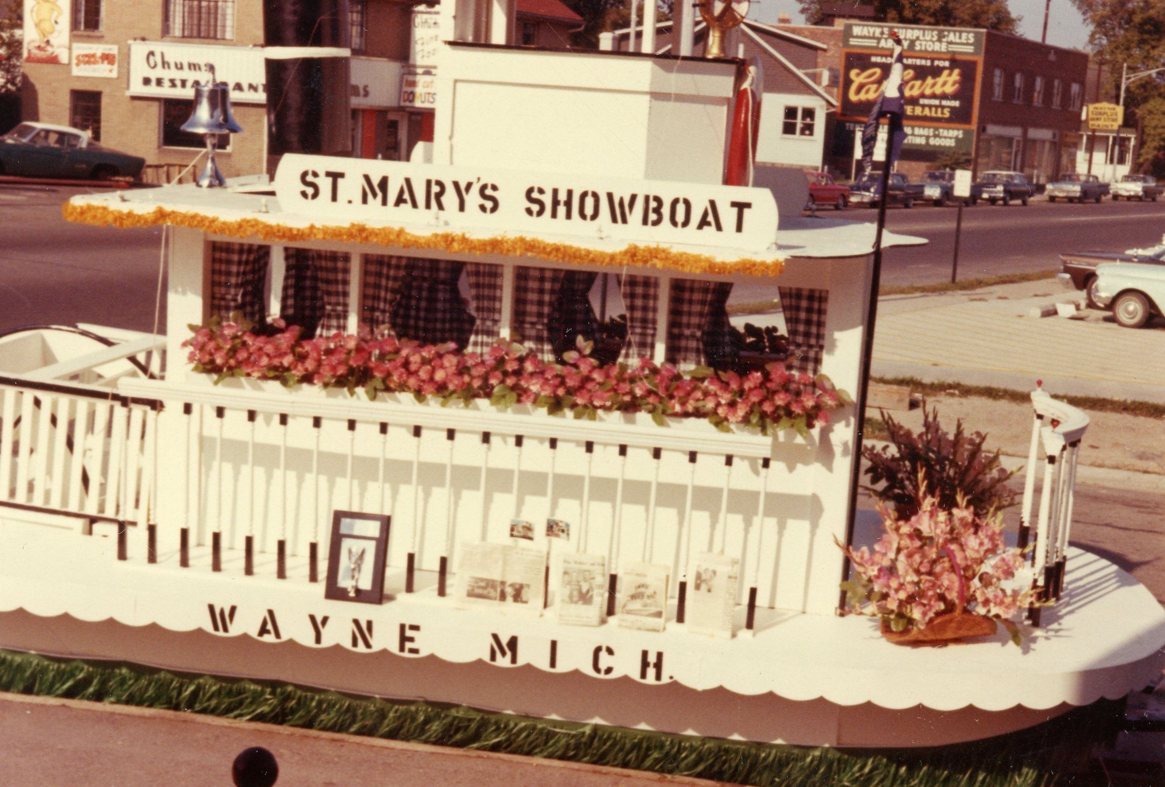 St. Marys Showboat parade float 9-11-1963. Michigan Avenue, Chums Donuts in background.