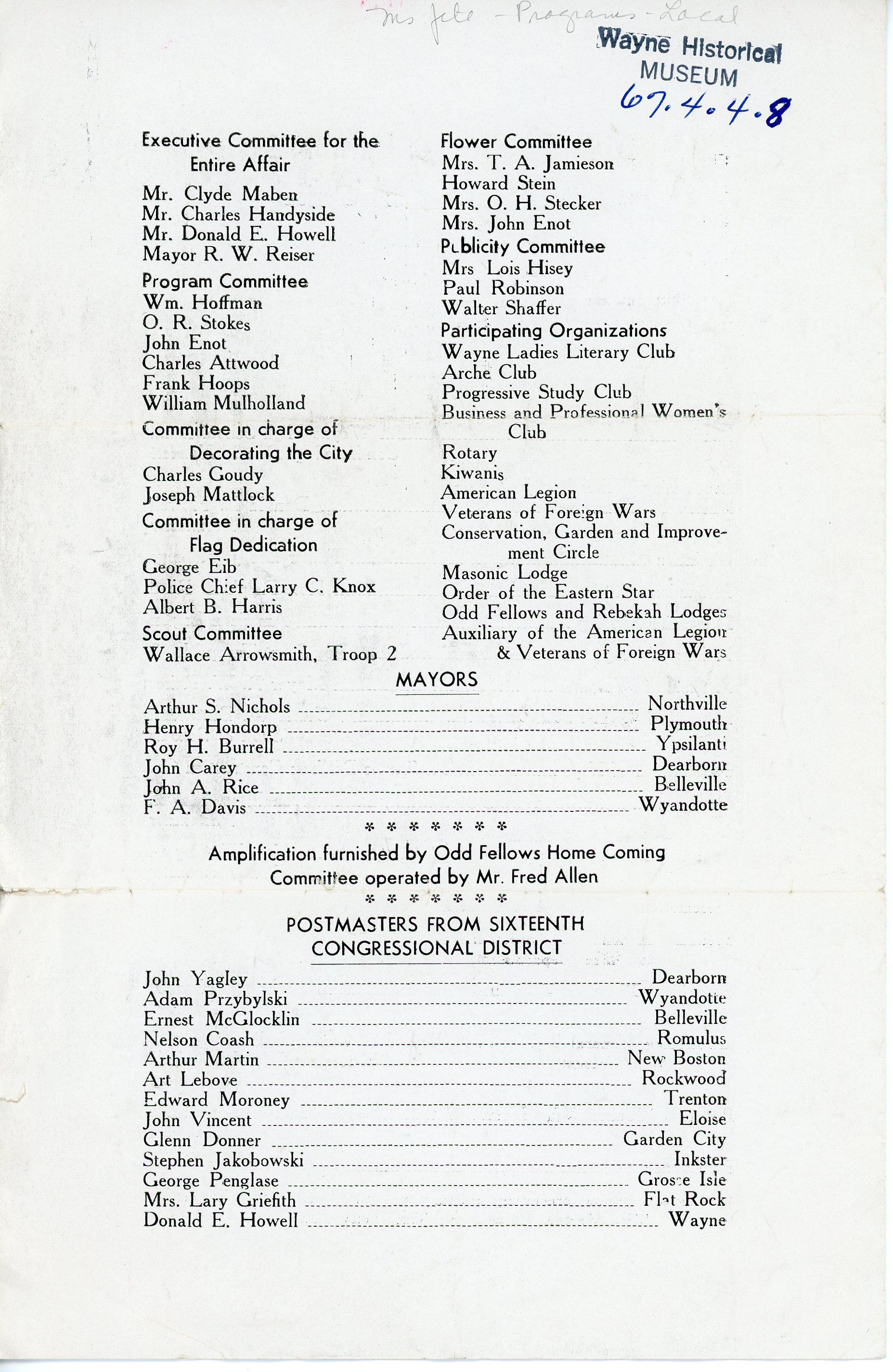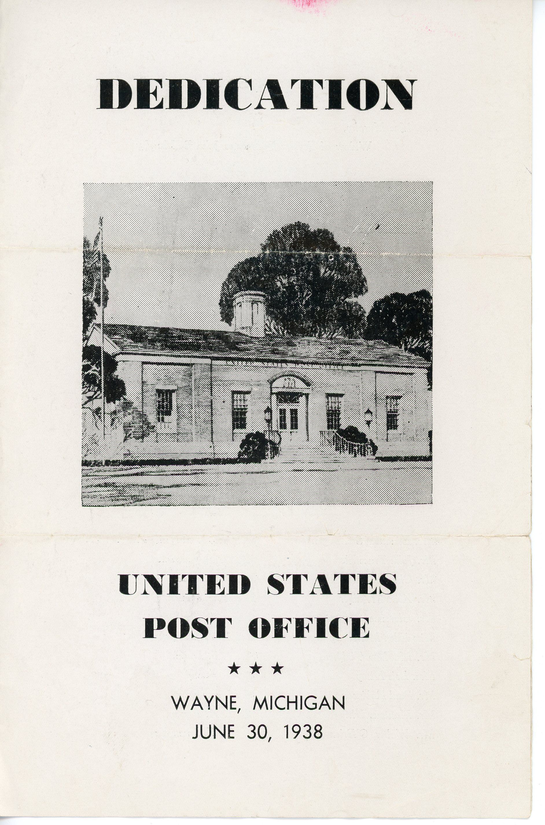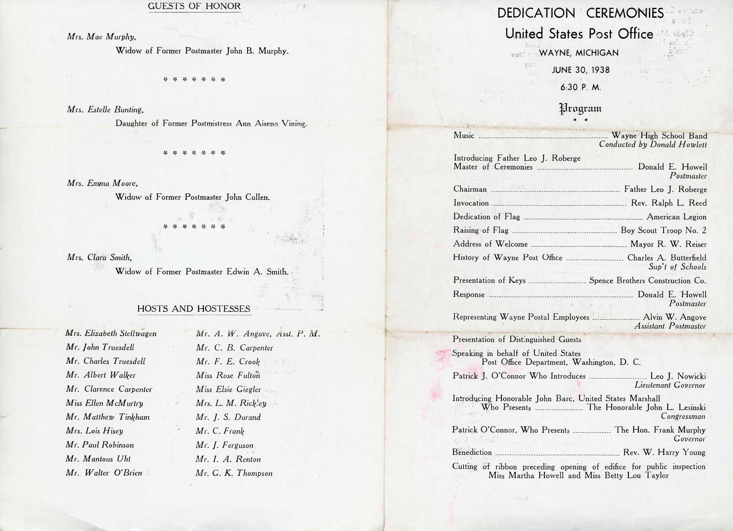 Inside pages of the Post Office Dedication Pamphlet showing Guests of Honor, hosts and Hostesses and the ProgramCataloged By