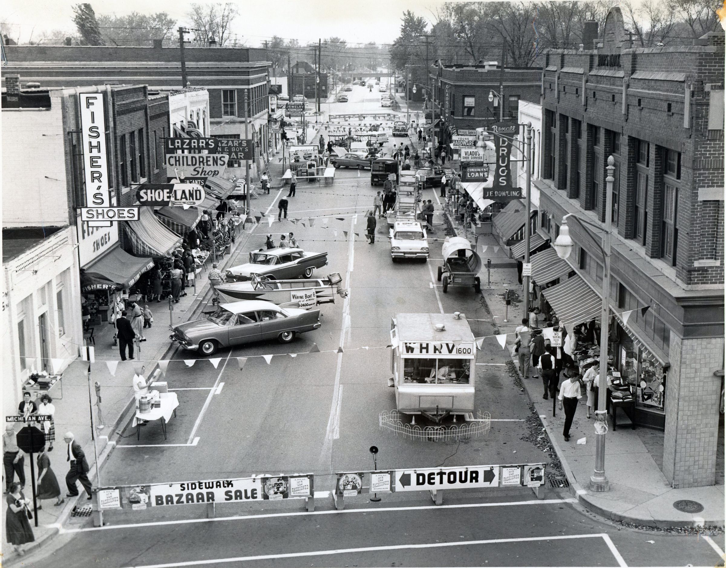 Sidewalk Sales Monroe Street looking South. October 1958. Fishers Shoes, Lazars, Rexall Drugs, Mulhollands, Hoops Block