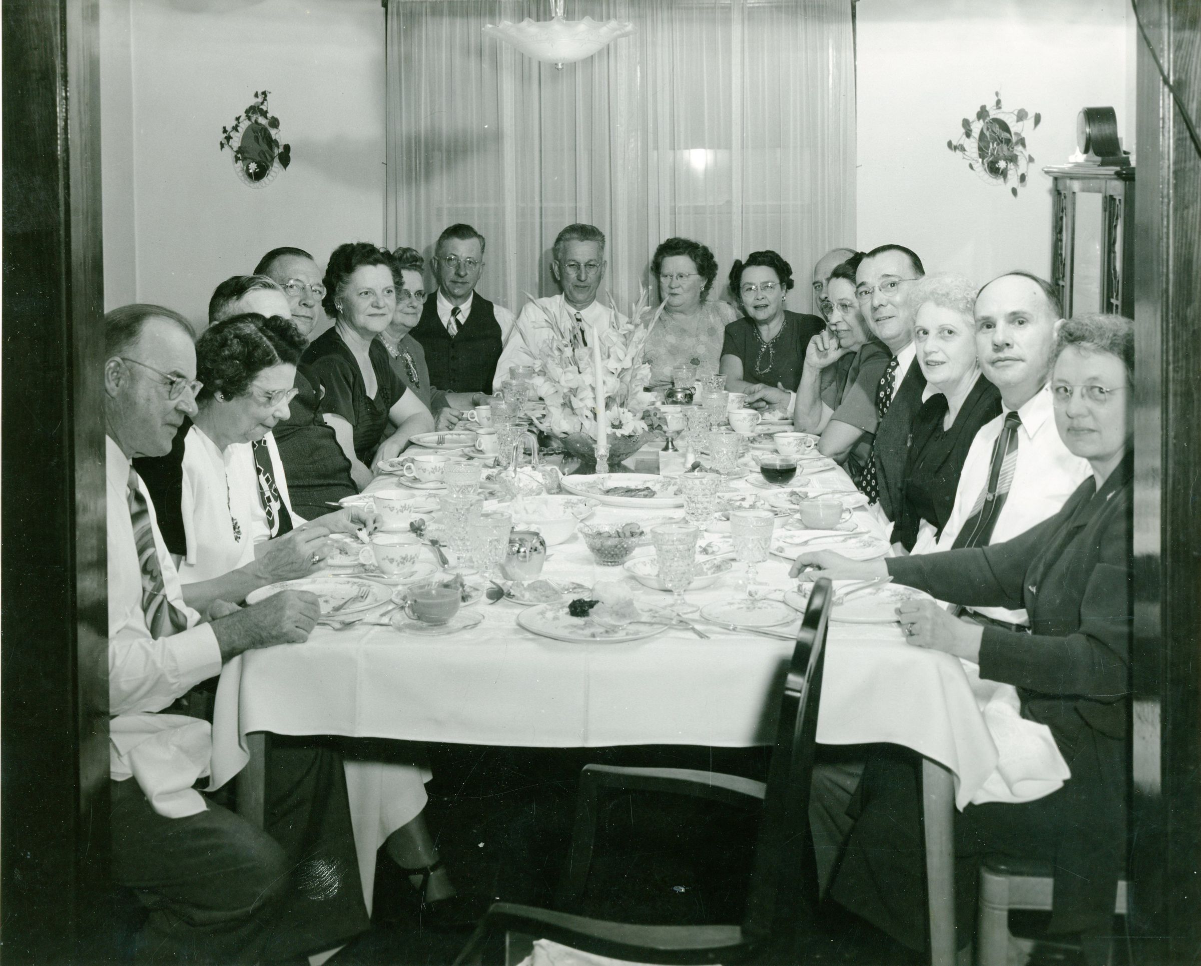 Euchre Club. (L-R) Ed Oehlka, Belle Oehlka, Al Baumgart, Charles Attwood, Martha Attwood, Pearl Sawslayer, Roy Sawslayer, Bill Janner, Hazel Janner, Jewel Baumgart, Al Sherwood, Gertrude Sherwood, John Campbell Sr, Gertrude Campbell, Frank Scott, Janice Scott.Cataloged By