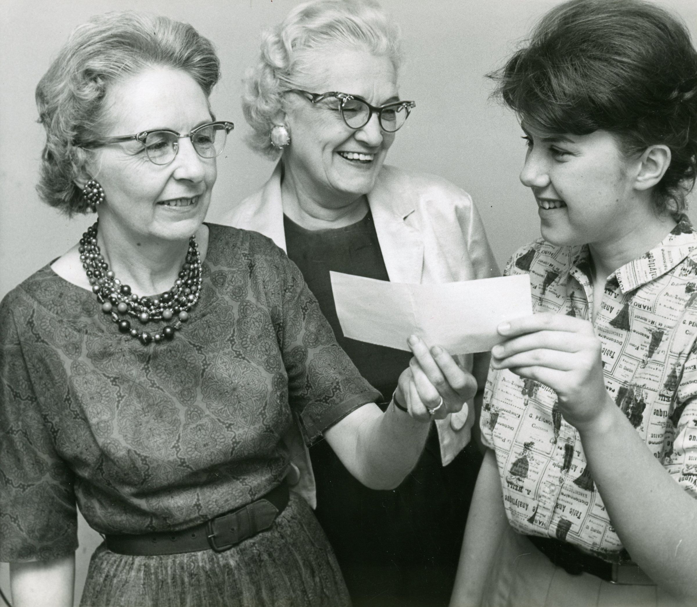 L-R: Mrs. Stockmeyer, unknown, Kathy Dave's daughter. Arche Given Scholarship. May 21, 1963. Eagle photo