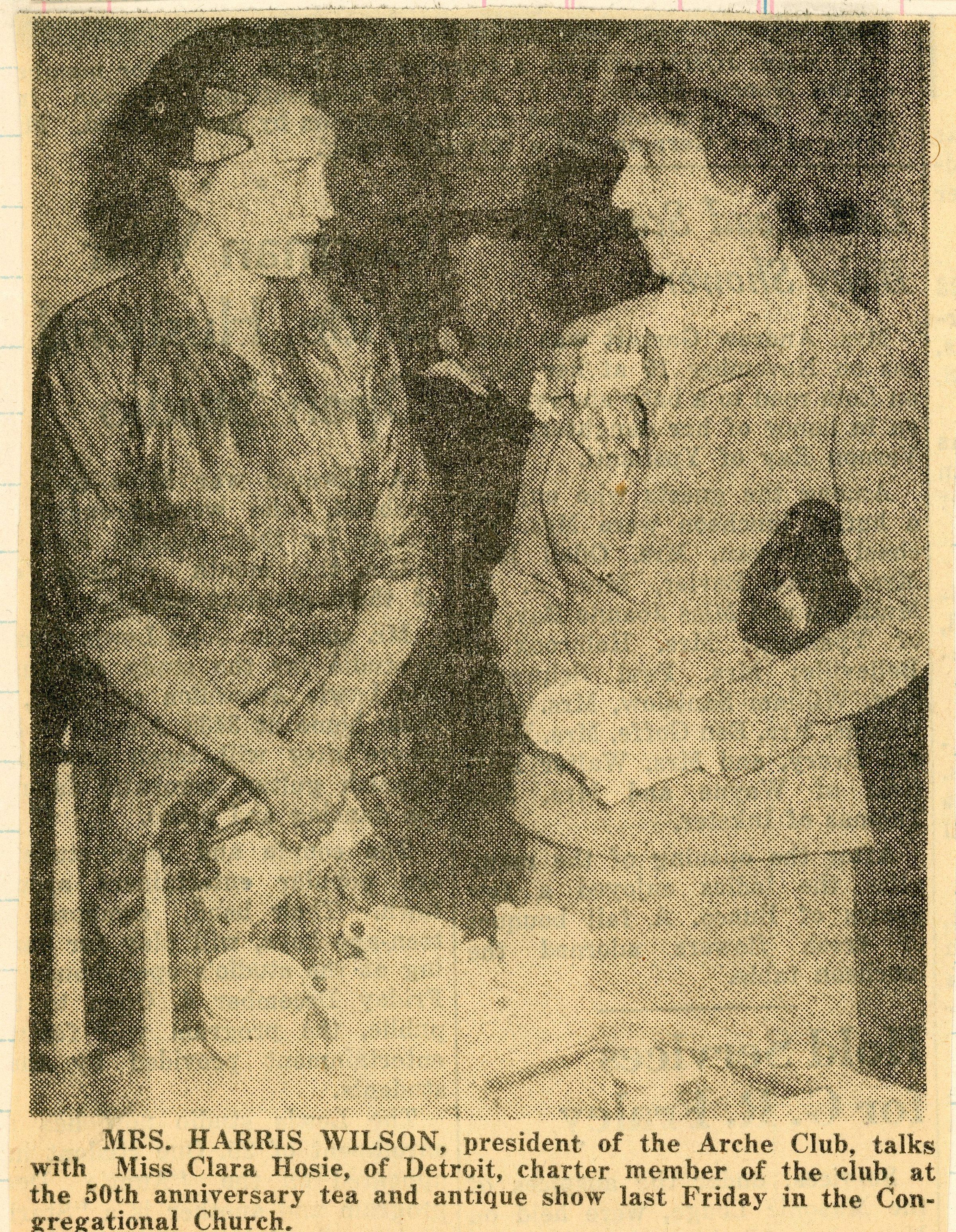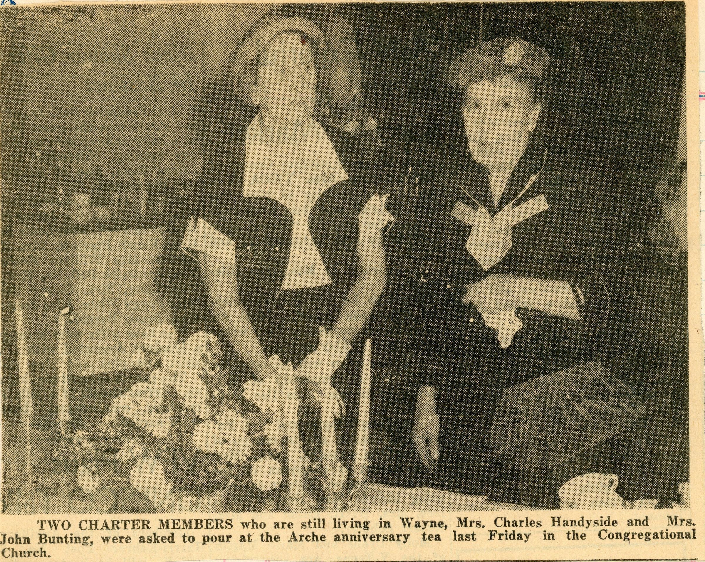 Two charter members who are still living in Wayne, Mrs. Charles Handyside and Mrs. John Bunting, were asked to pour at the Arche anniversary tea last Friday in the Congregational Church.