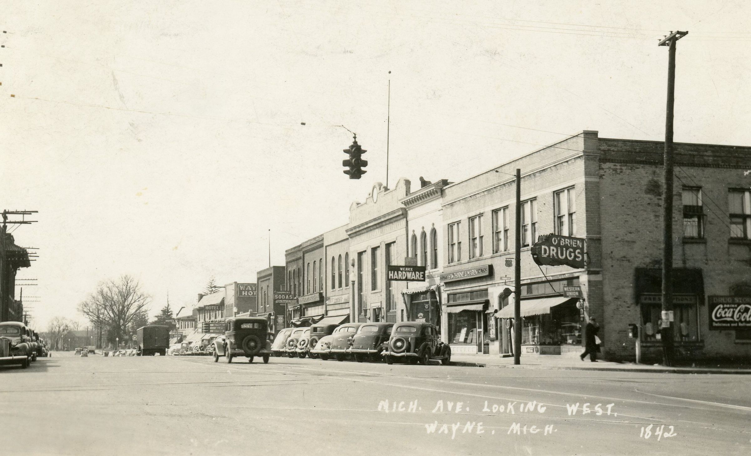 Michigan Avenue looking West from Wayne road, showing north side buildings, the Bank block. O'Briens Drug Store. Pre 1940.Cataloged By