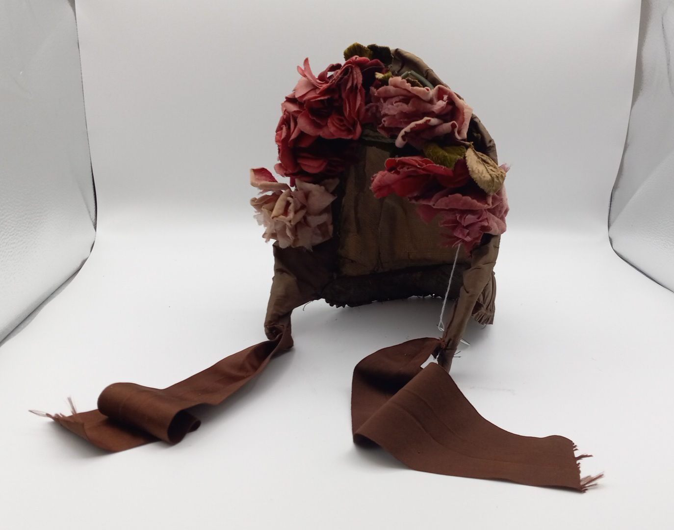 Brown silk, ruffled and shirred, red and pink rose around brim, and brown ribbon ties.