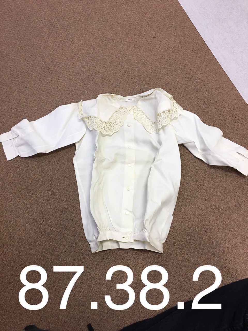 Blouse owned by Jay Cozadd, has an off white color with a fancy lace collar.Context