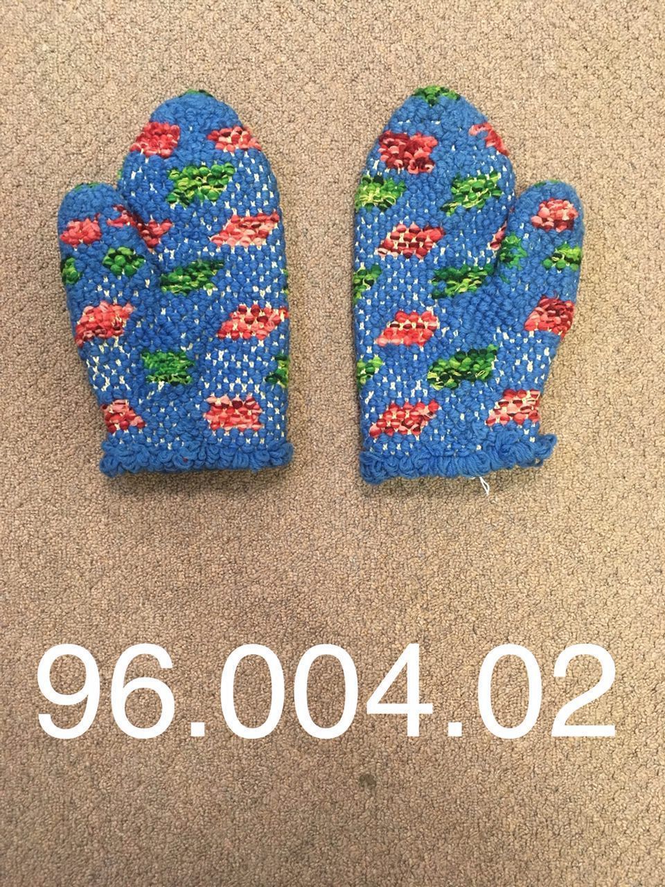 Kitchen Oven Mitts knitted by L Straight, donated by Mildred Wight.