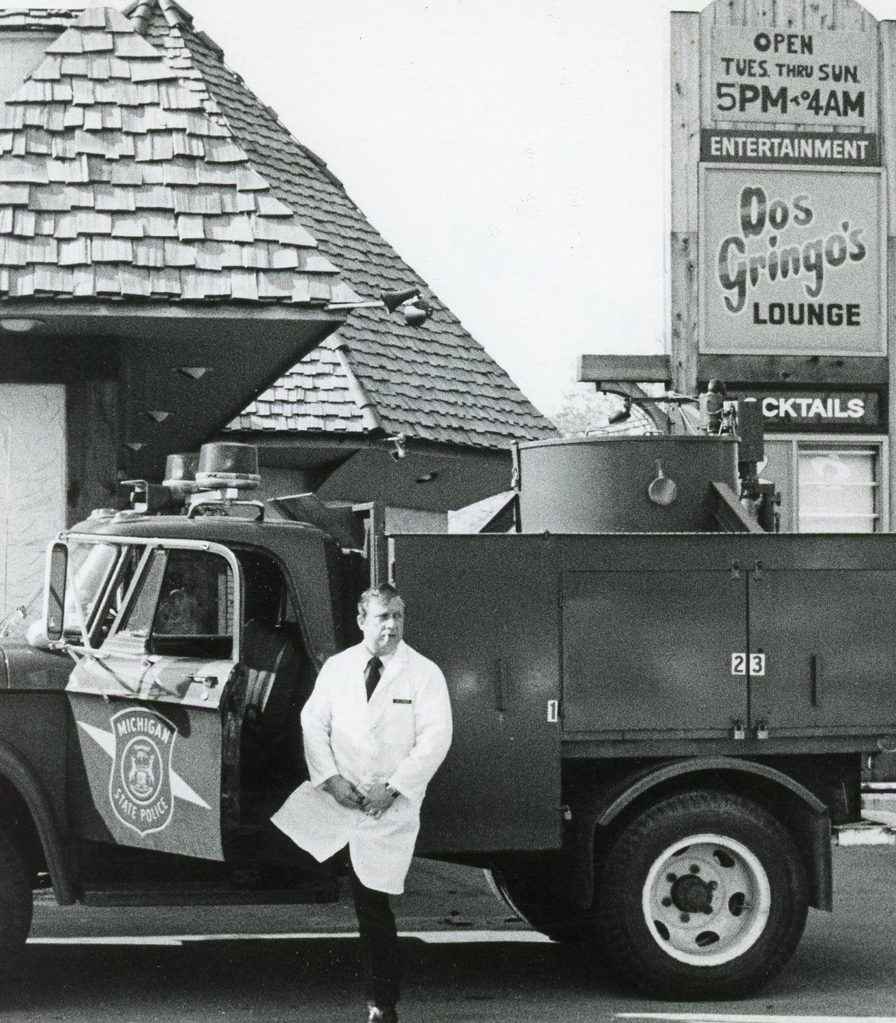 Dos Gringos Lounge, Inkster, MI. Middlebelt Rd. May 9, 1977. Photo by Lothar E. Konietzko. Michigan State Police truck in parking lot.