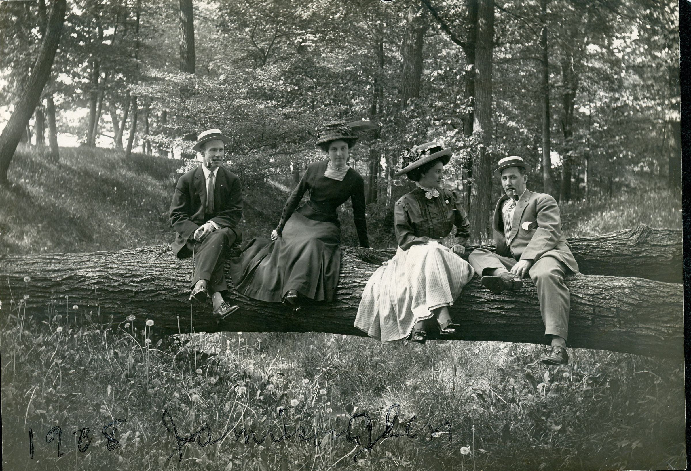 Jewell and Walter O'Brien (at right) and friends in Jamieson's Glenn in 1908. This is the day of Jewell and Walter became engaged.