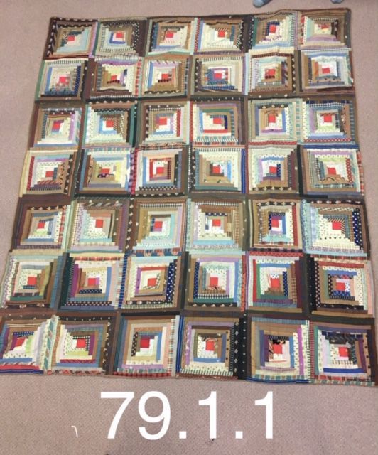 Quilt has a log cabin pattern with an attached handwritten note by Grace Peters stating, "My Great Grandma Nancy Coleburn's."Context