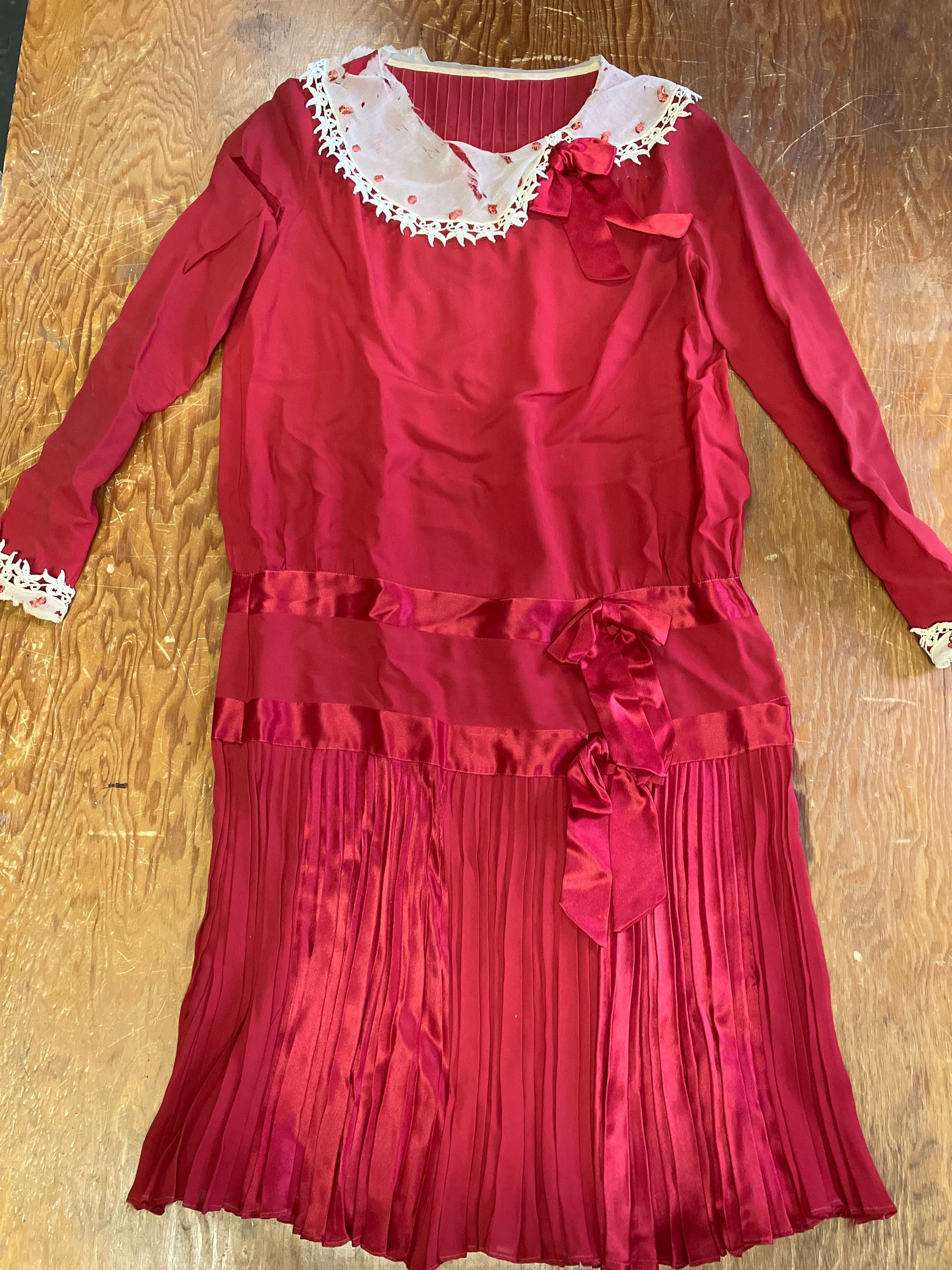 Red silk dress with lace collars. Poor condition.