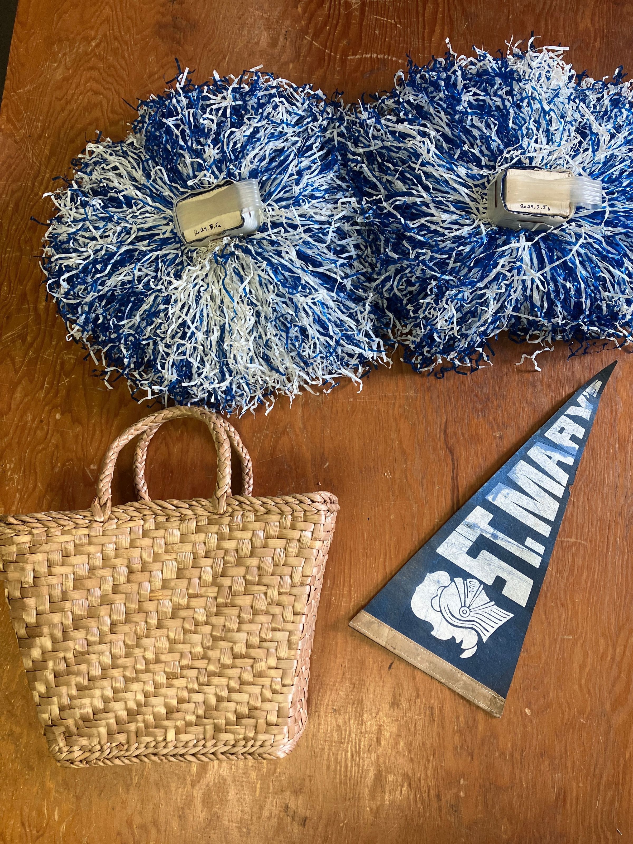 St. Mary’s high school cheerleader Pom poms. 2024.3.5a basket, 2024.5.17 st Mary’s pennant.