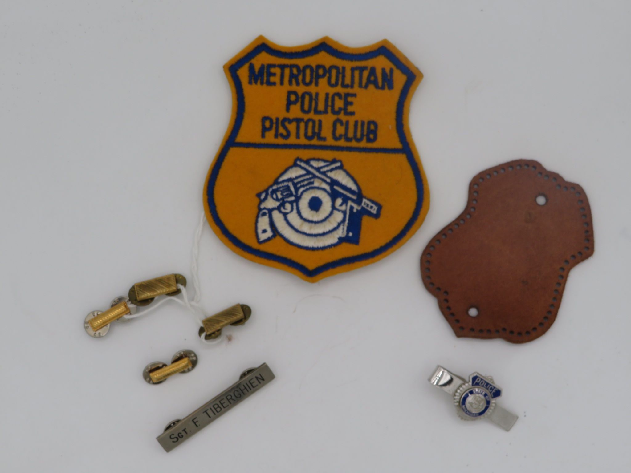 Items include badge holder, a patch, tie clip, and various pins, one pin includes the name "Tibershein".