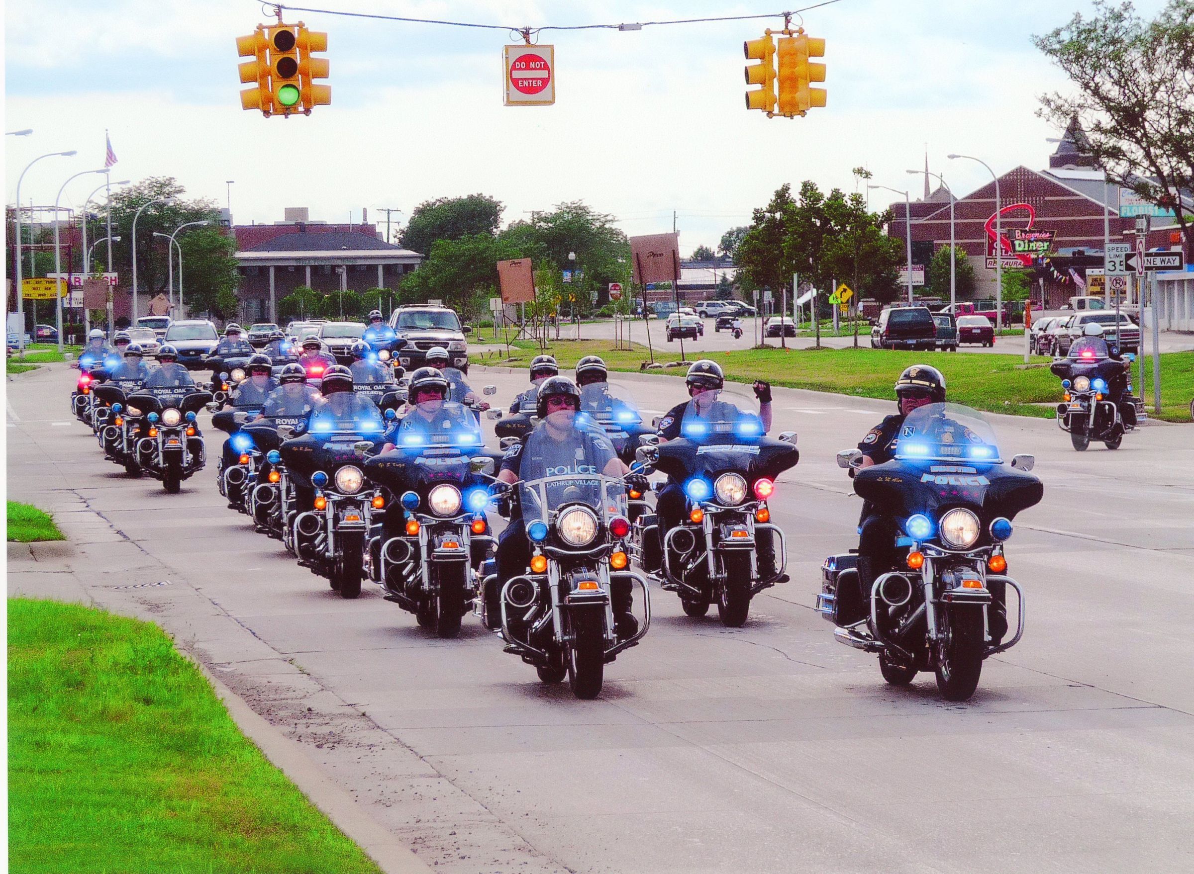 Police Officers on Motorcycles on Michigan Ave in Wayne. Lents funeral Home, St. Marys School and Brownies Diner seen in Background.Cataloged By