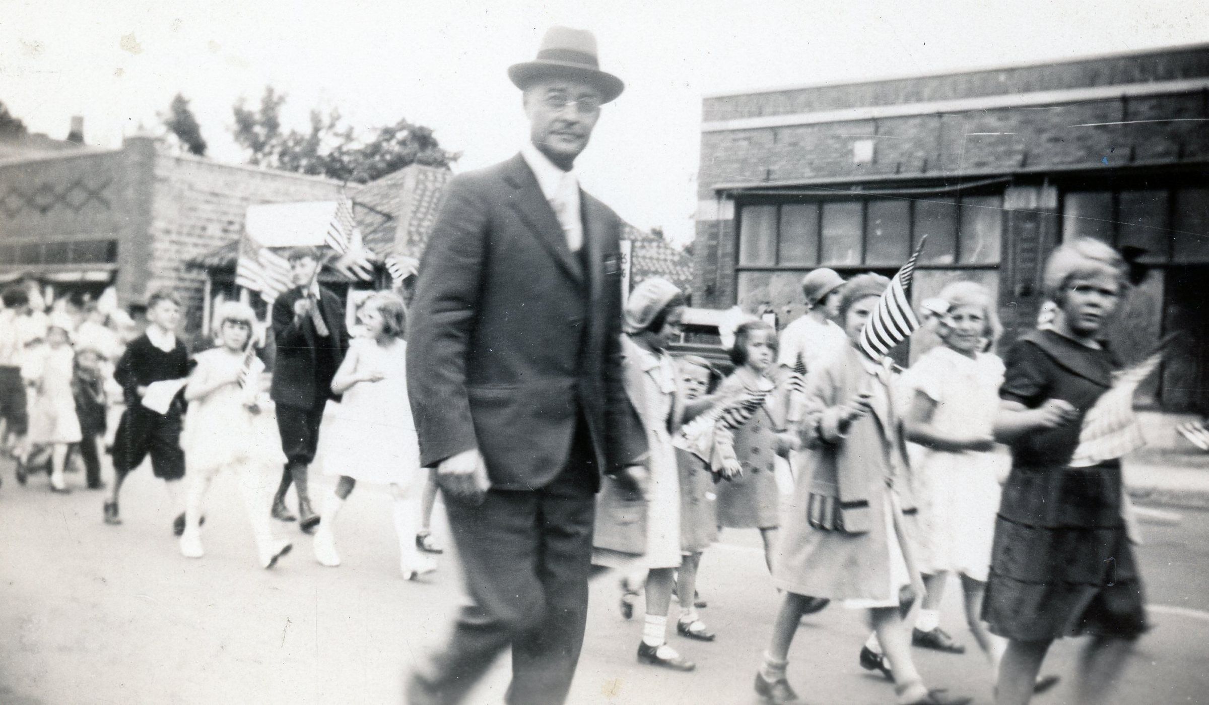 D.S Yape, superintendent of Wayne Public Schools from 1925 to 1936. Girl leading the Pre WWII parade is Ester Jean Sloss.