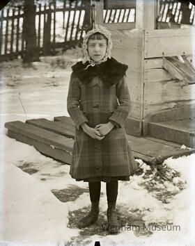 Marion Gray standing outside near a well in the winter. She wears a coat with a fur collar.