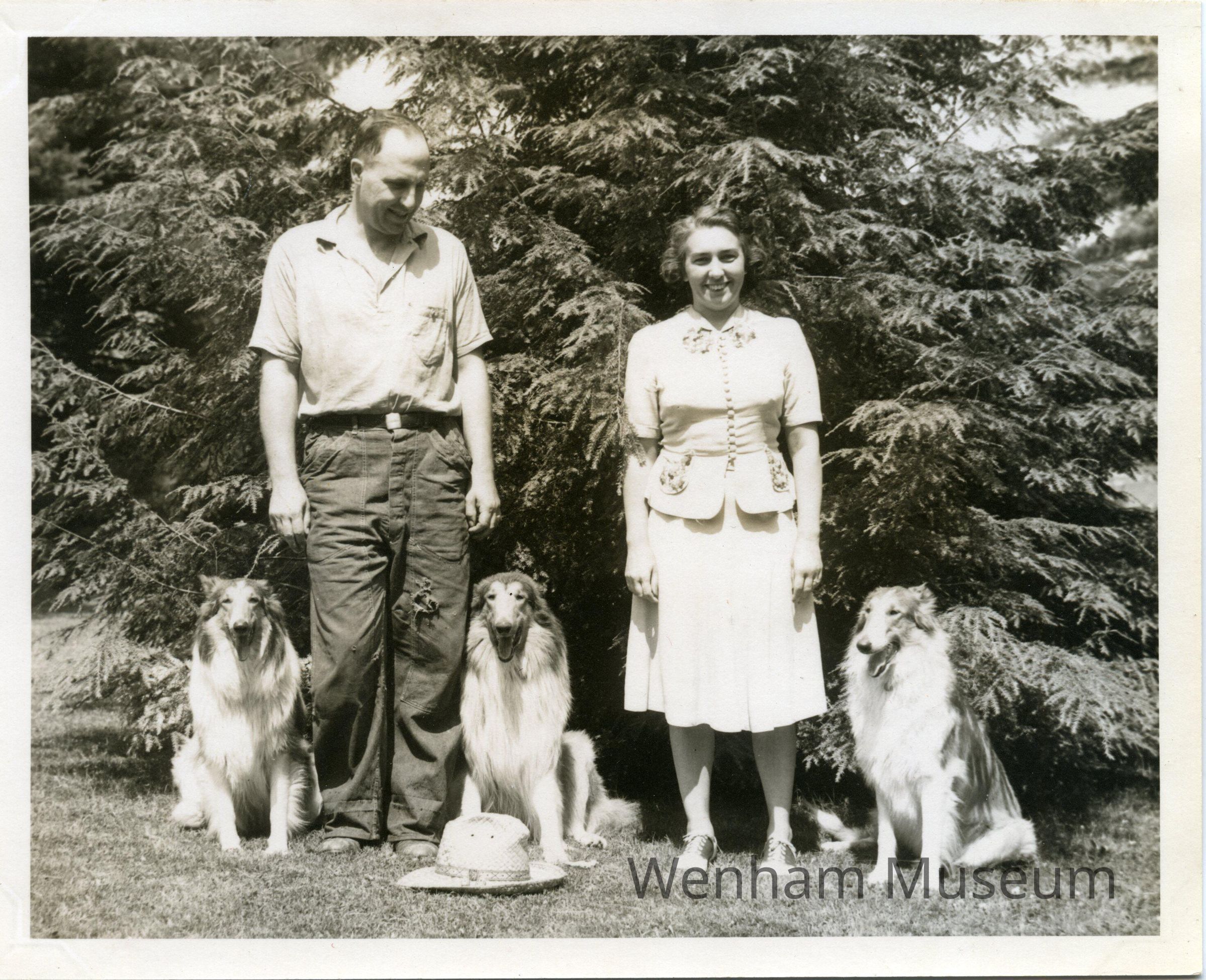The Kraeger Family, Vinnie Kraeger, Marion Krager, and three Collies, from photograph album entitled "The / Todd's Own / Book of Wenham" / !943-1946." Album contains 28 sepia colored photographs mounted with gold corner mounts. Photographs include: [Wenham] "Town Hall," "The Church," "The Teahouse," "The School" and family photographs of "The / Todd's / Wenham Friends" and pictures of their homes in Wenham. Families include, "The Arnolds," "The Bells," "The Crehores [family photo missing]," "The Harringtons," "The Jeffers," "The Johnsons," "The Kennards," "The Kraegers," "The Linderoths," "The McKenzies," "The McLaughlins [photo of their home missing]," "The Prahls" and "The Todds."