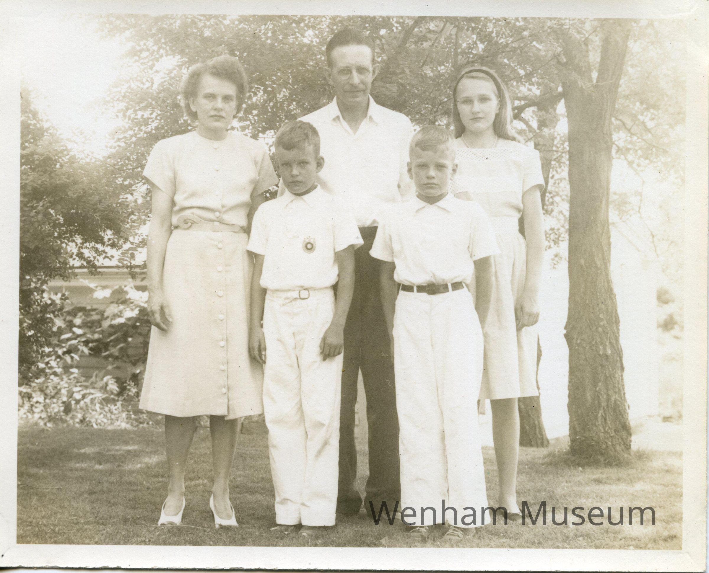 The Bell Family, Don Bell, Miriam Bell, Judy Bell, Richard Bell, David Bell from photograph album entitled "The / Todd's Own / Book of Wenham" / !943-1946." Album contains 28 sepia colored photographs mounted with gold corner mounts. Photographs include: [Wenham] "Town Hall," "The Church," "The Teahouse," "The School" and family photographs of "The / Todd's / Wenham Friends" and pictures of their homes in Wenham. Families include, "The Arnolds," "The Bells," "The Crehores [family photo missing]," "The Harringtons," "The Jeffers," "The Johnsons," "The Kennards," "The Kraegers," "The Linderoths," "The McKenzies," "The McLaughlins [photo of their home missing]," "The Prahls" and "The Todds."