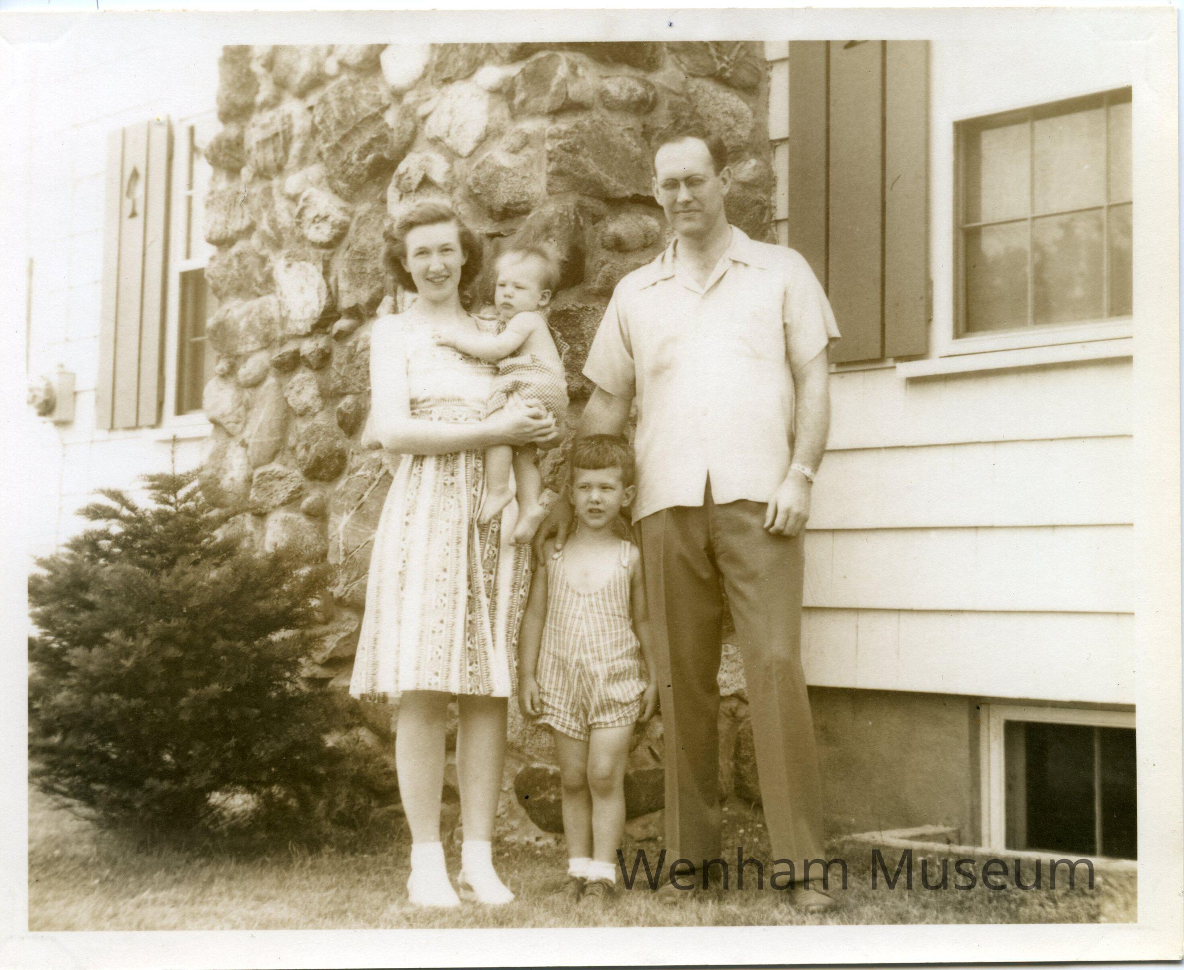 The McLaughlin Family, Karl McLaughlin, Shirley McLaughlin, Jim McLaughlin, John McLaughlin, Katherine McLaughlin, from photograph album entitled "The / Todd's Own / Book of Wenham" / !943-1946." Album contains 28 sepia colored photographs mounted with gold corner mounts. Photographs include: [Wenham] "Town Hall," "The Church," "The Teahouse," "The School" and family photographs of "The / Todd's / Wenham Friends" and pictures of their homes in Wenham. Families include, "The Arnolds," "The Bells," "The Crehores [family photo missing]," "The Harringtons," "The Jeffers," "The Johnsons," "The Kennards," "The Kraegers," "The Linderoths," "The McKenzies," "The McLaughlins [photo of their home missing]," "The Prahls" and "The Todds."