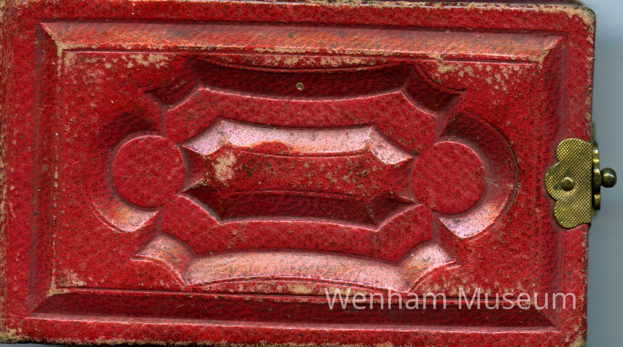 Photograph album, red leather, 3 3/8 x 2 x 7/8," belonged to Mamie A. Wilkins of Wenham, MA. Tintypes of Wenham people.