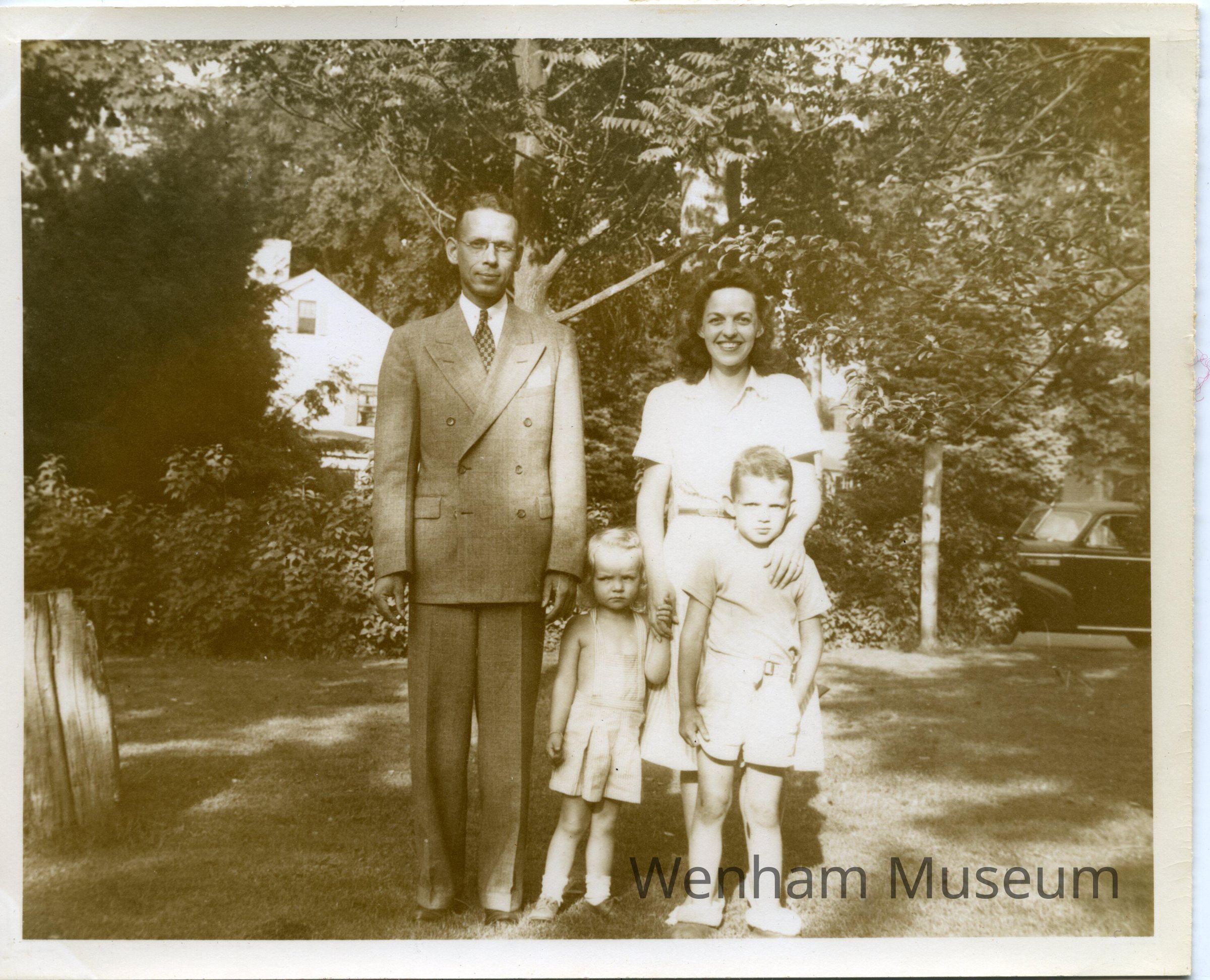 The Johnson Family, Hal Johnson, Threba Johnson, Chris Johnson, Debbie Johnson, from photograph album entitled "The / Todd's Own / Book of Wenham" / !943-1946." Album contains 28 sepia colored photographs mounted with gold corner mounts. Photographs include: [Wenham] "Town Hall," "The Church," "The Teahouse," "The School" and family photographs of "The / Todd's / Wenham Friends" and pictures of their homes in Wenham. Families include, "The Arnolds," "The Bells," "The Crehores [family photo missing]," "The Harringtons," "The Jeffers," "The Johnsons," "The Kennards," "The Kraegers," "The Linderoths," "The McKenzies," "The McLaughlins [photo of their home missing]," "The Prahls" and "The Todds."