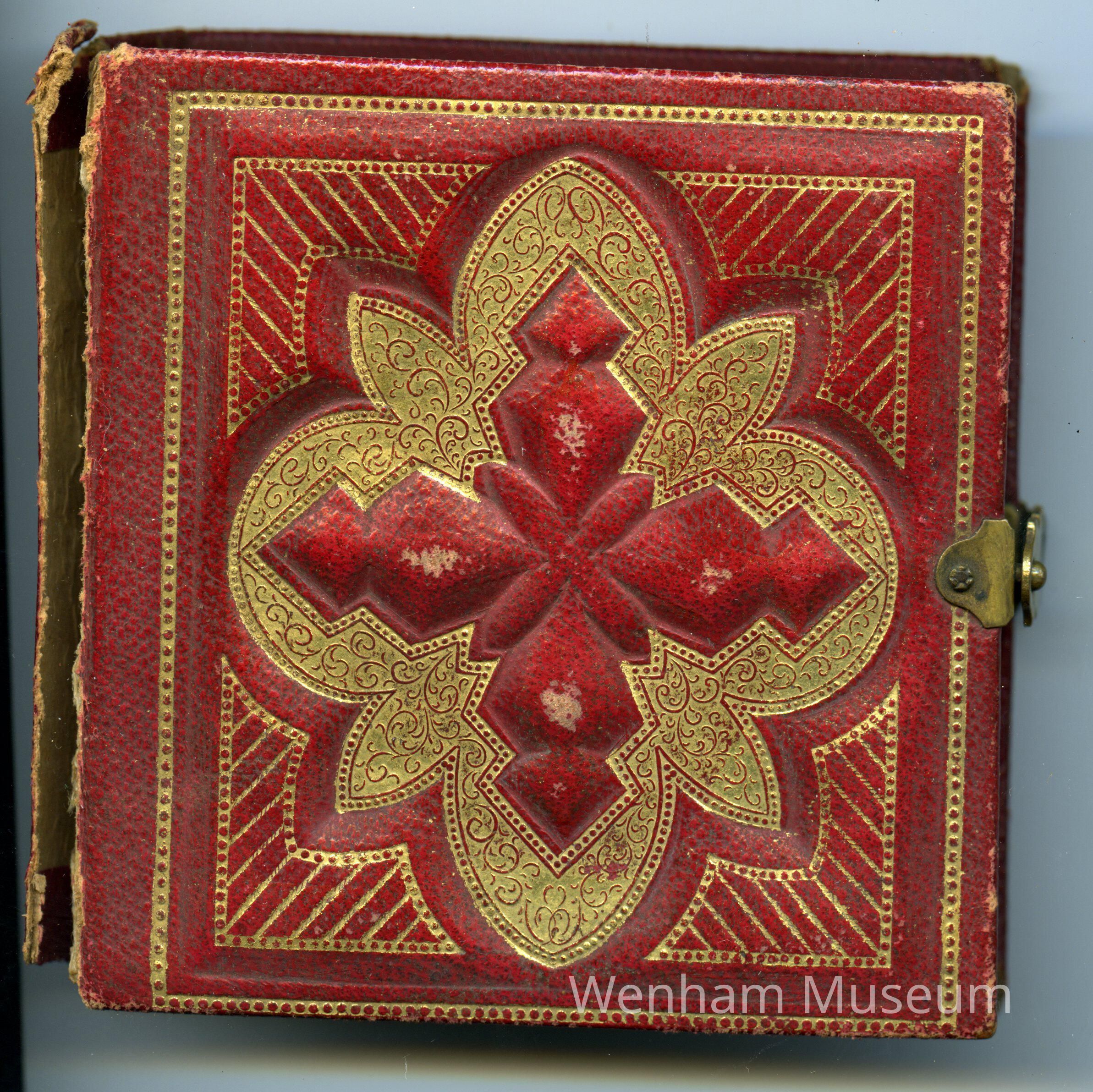 Small photograph album, 3.5x3.5x.75." Red leather cover, embossed with gold with a brass clasp. In pencil: Mary E. Conant, Wenham," inside front cover, 87 small, framed oval tintypes with no identification, glued into place. One double portrait and one with four people.